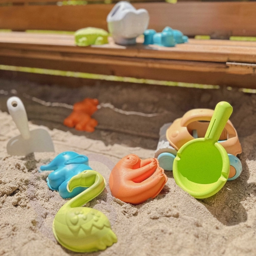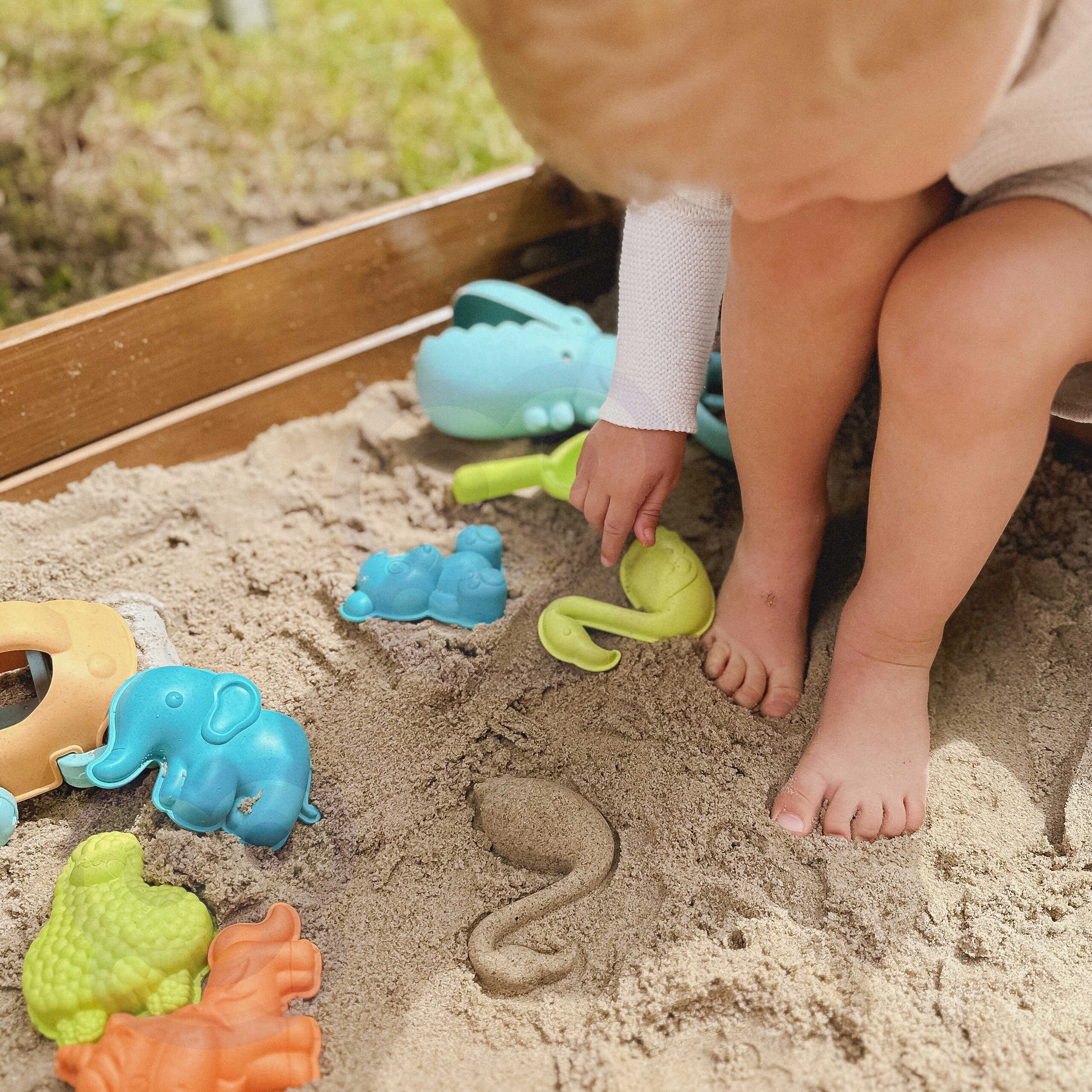 Verschiedene Tierförmchen, Schaufeln und ein Sieb regen die Fantasie an und fördern die Feinmotorik beim Bauen, Schütten und Formen von Sand.
