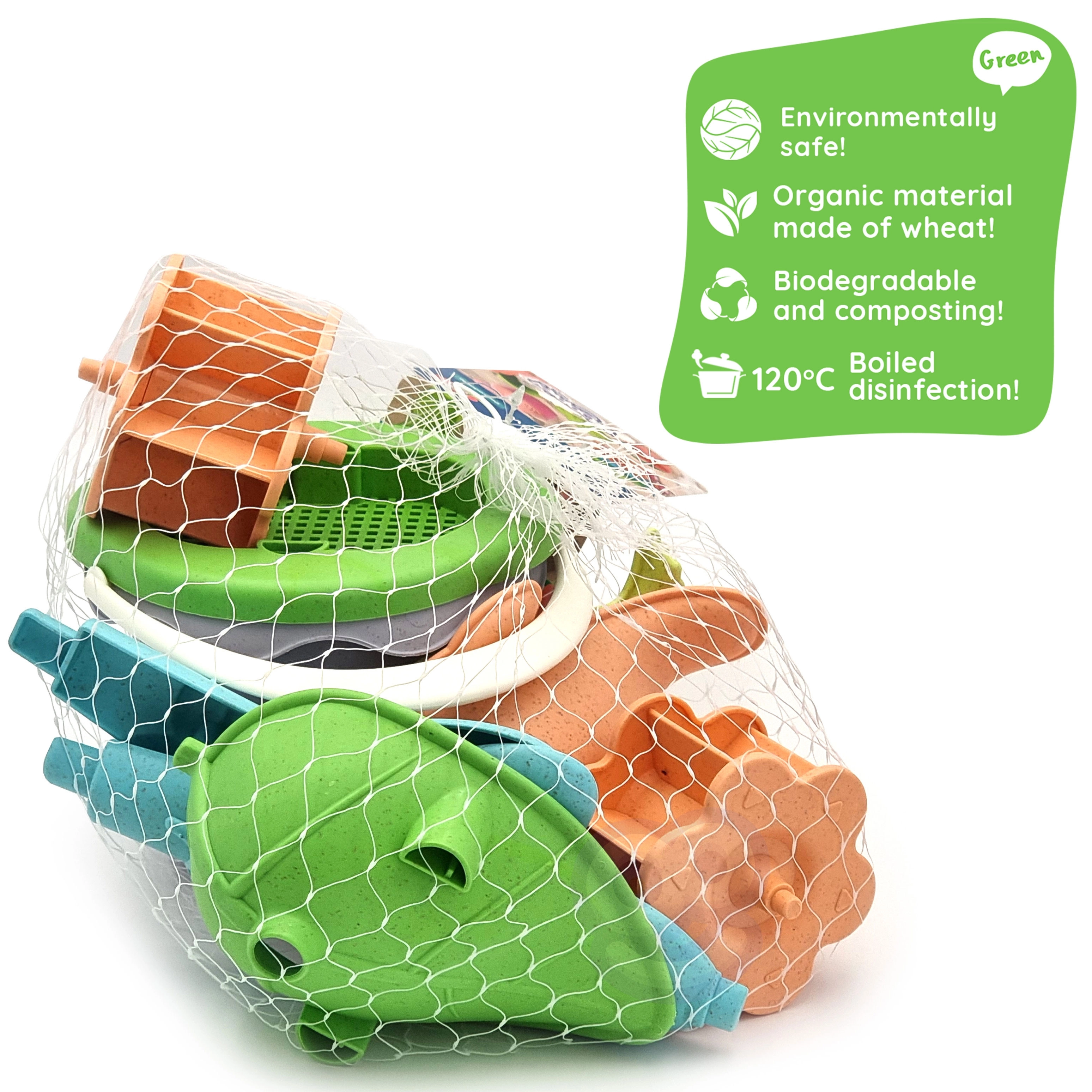 Das Set besteht aus organischem, biologisch abbaubarem Material auf Pflanzenbasis, das kompostierbar ist. Sanfte Formen, robuster Kunststoff und einfache Pflege gewährleisten eine sichere und langlebige Nutzung. Die Pastellfarben erfreuen Kinder und Eltern gleichermaßen und passen hervorragend zu weiterem Strandspielzeug.