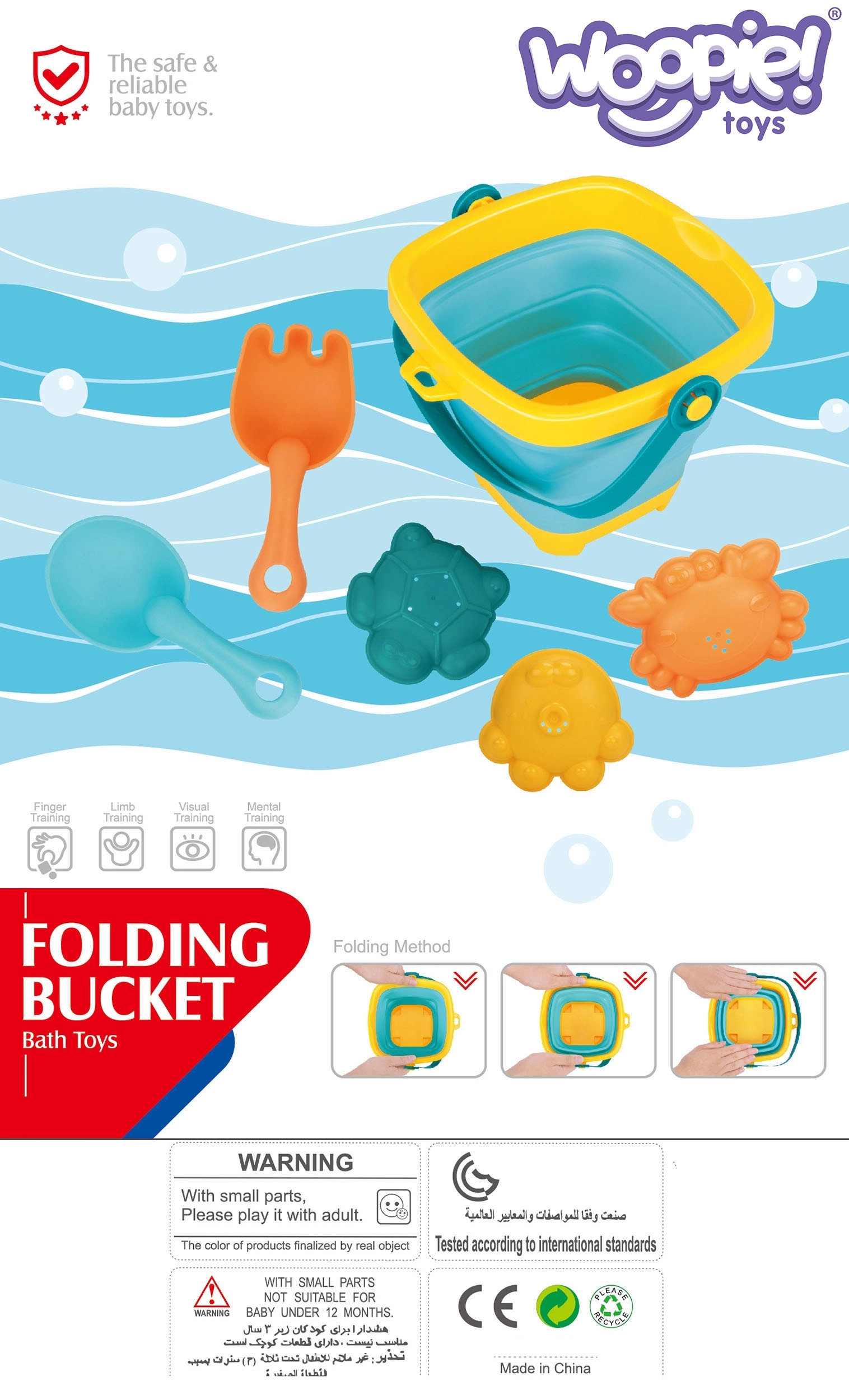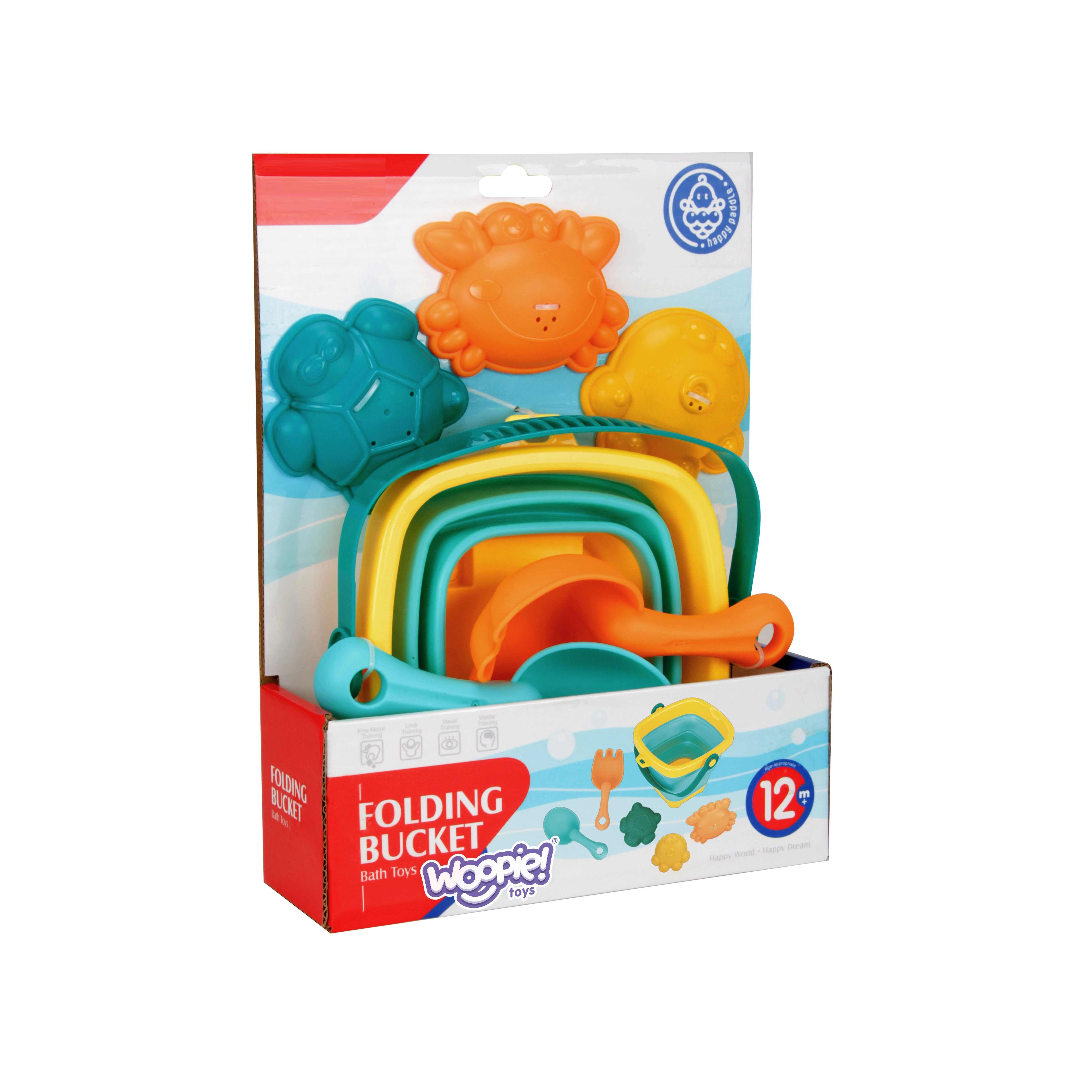 Mit diesem bunten WOOPIE-Set genießen Kinder endlosen Spaß am Wasser und im Sand. Der faltbare Silikoneimer mit Kunststoffrand und -boden lässt sich im Handumdrehen zu einer flachen Form zusammenklappen, sodass er kaum Platz einnimmt und in jede Tasche passt. Die flexiblen Werkzeuge und Förmchen sind widerstandsfähiger gegen Risse und angenehm für kleine Kinderhände.