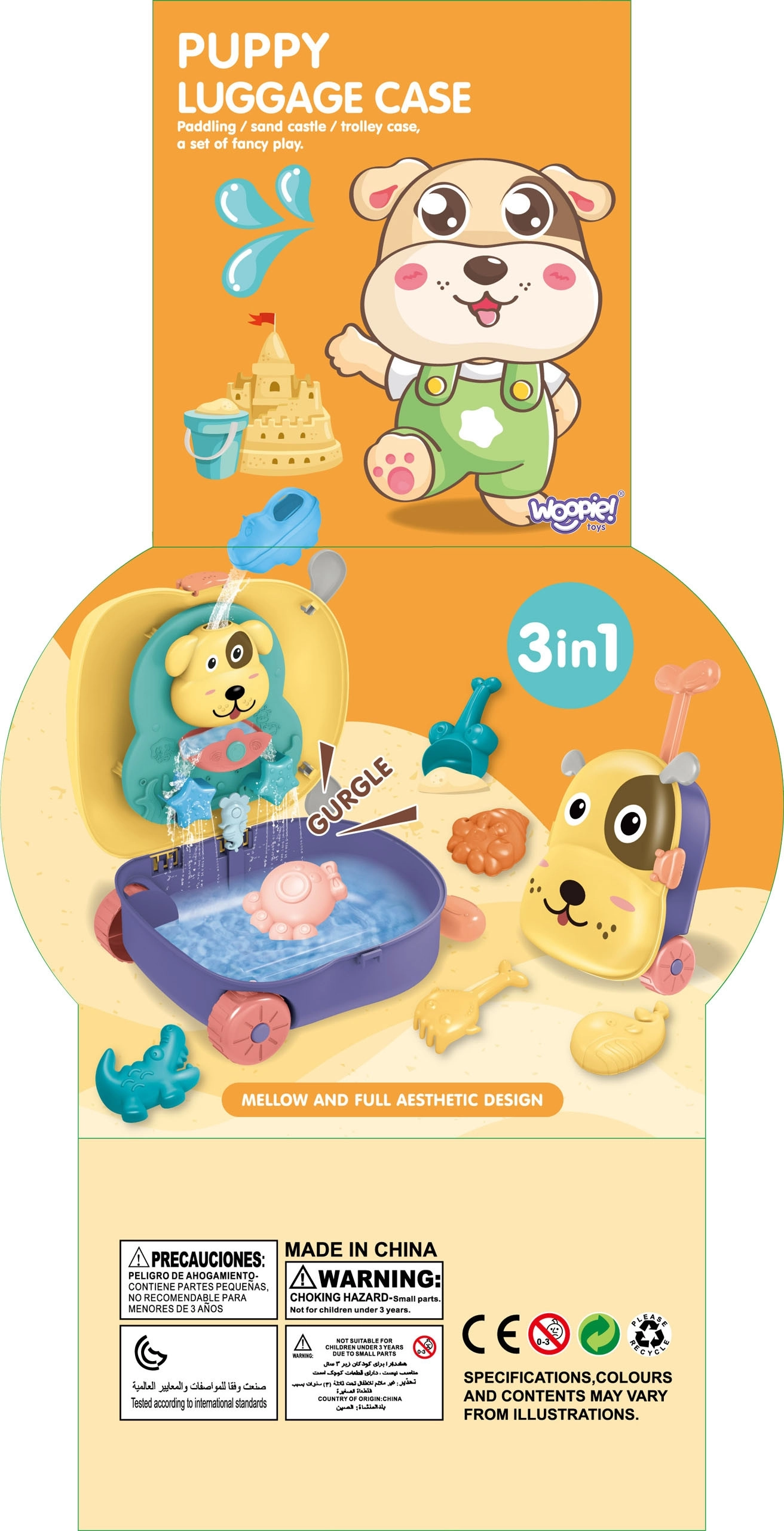 Nach dem Öffnen wird der Koffer zu einem flachen Becken. Gieße Wasser in das Panel mit Hundef Gesicht und beobachte, wie sich die Räder drehen und eine Wasserkaskade entsteht, die Kinder lange begeistert.