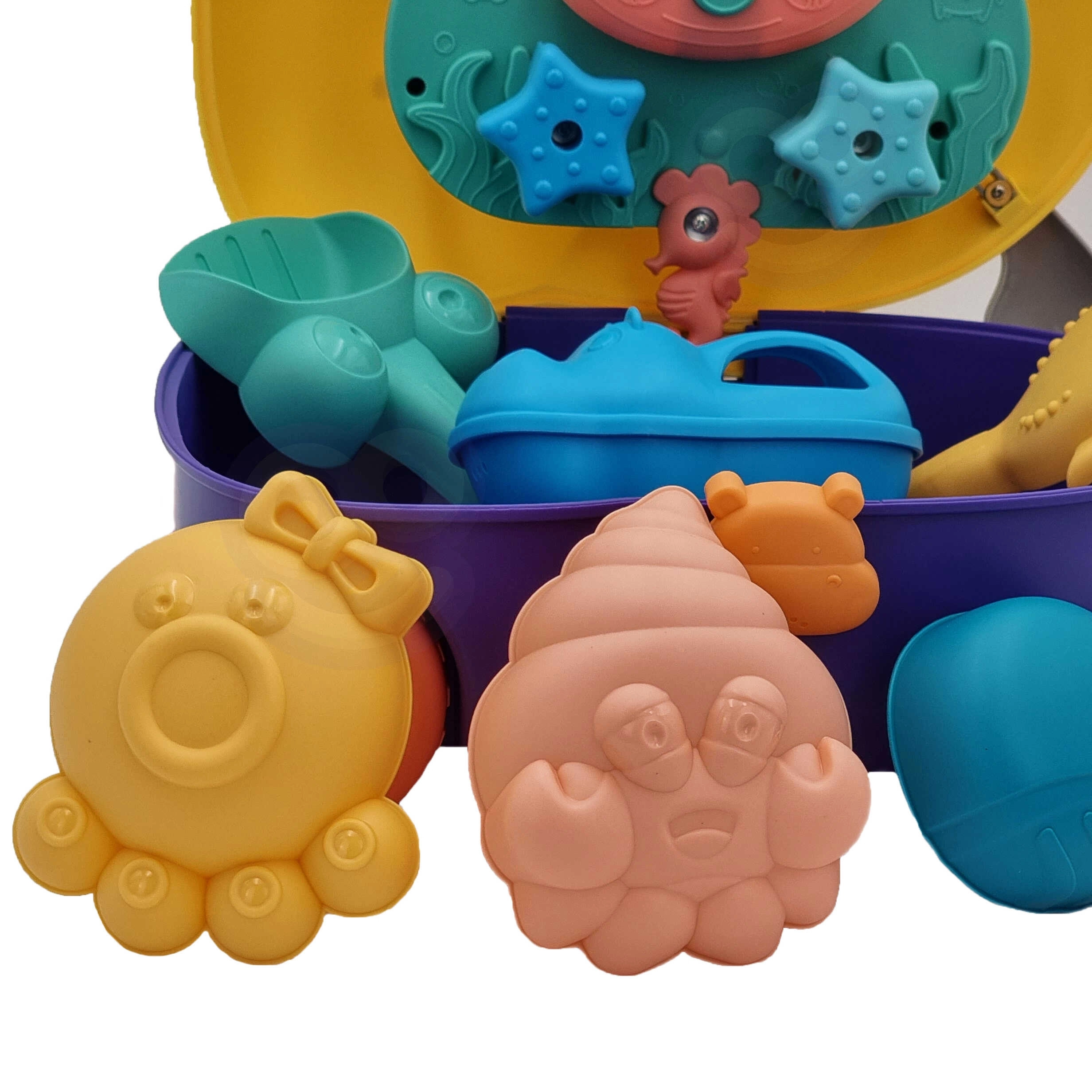 Enthalten sind Schaufeln, Harke und Förmchen für vollständige Sandspiele zu zweit. Alles hat abgerundete Formen und bunte Farben, die Spaß machen und gleichzeitig die Hand-Auge-Koordination fördern. Das Set ist für Kinder ab 3 Jahren konzipiert und dank des verschließbaren Koffers bleiben alle Teile ordentlich zusammen.
