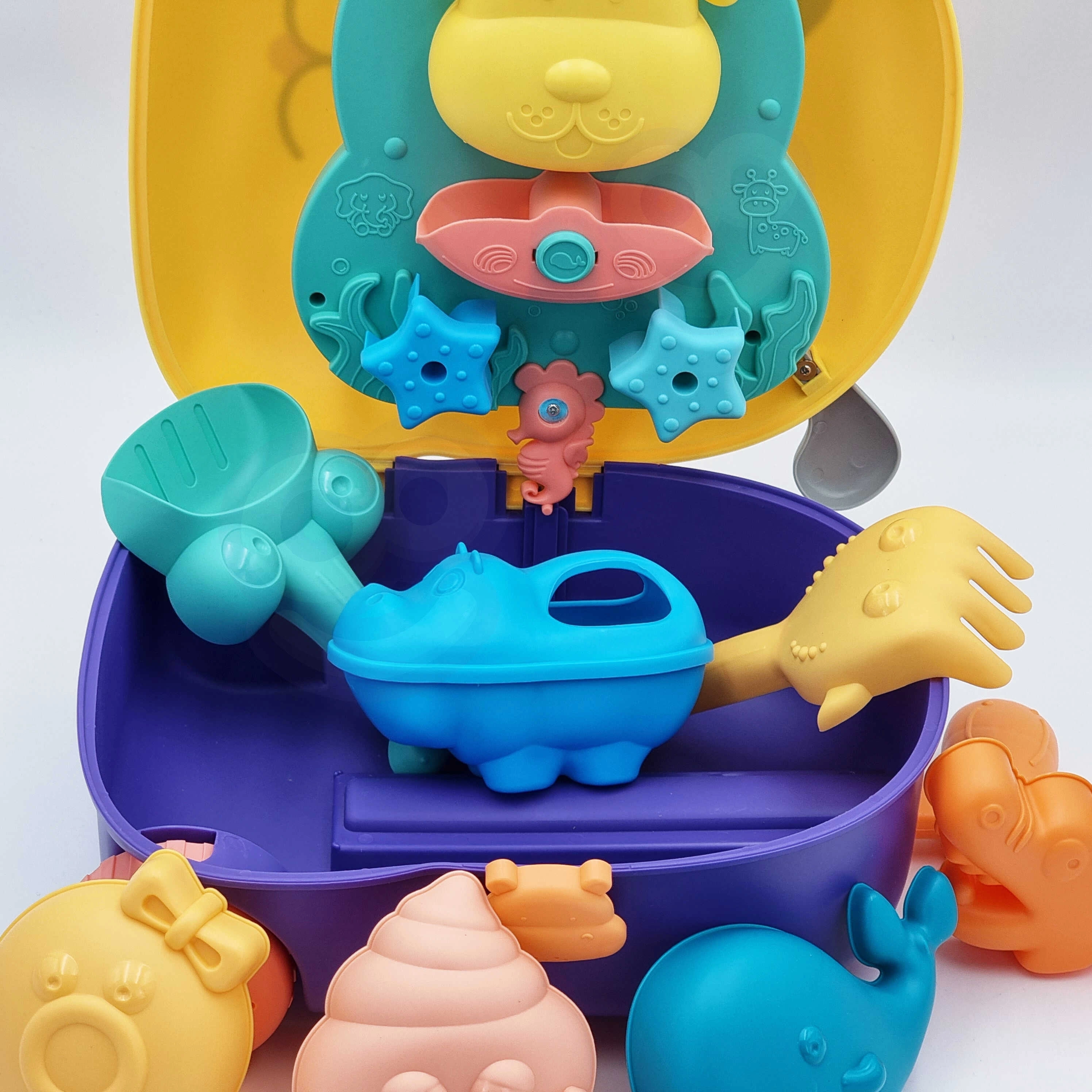 Enthalten sind 8 Teile: Koffer/Behälter, Gießbecher, Förmchen, Schaufel und Rechen für Spielspaß mit Sand und Wasser. Das Spielzeug fördert Feinmotorik, Hand-Auge-Koordination und sensorische Wahrnehmung. Geeignet zum Spielen drinnen und draußen – im Bad, im Garten und im Urlaub.