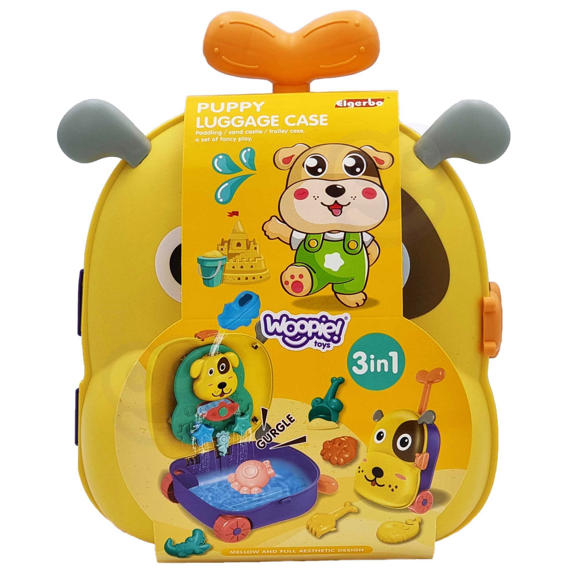 Der kompakte Koffer in Hundeform mit Rollen und ausziehbarem Griff enthält alles, was Kinder für kreatives Spielen mit Wasser und Sand brauchen. Beim Öffnen entsteht ein flaches Becken; mit dem Becher gießt das Kind Wasser in den oberen Bereich und beobachtet, wie es über rotierende Sternchen und Rinnen fließt. Dank glatter, abgerundeter Teile ist das Set sicher und leicht zu transportieren.