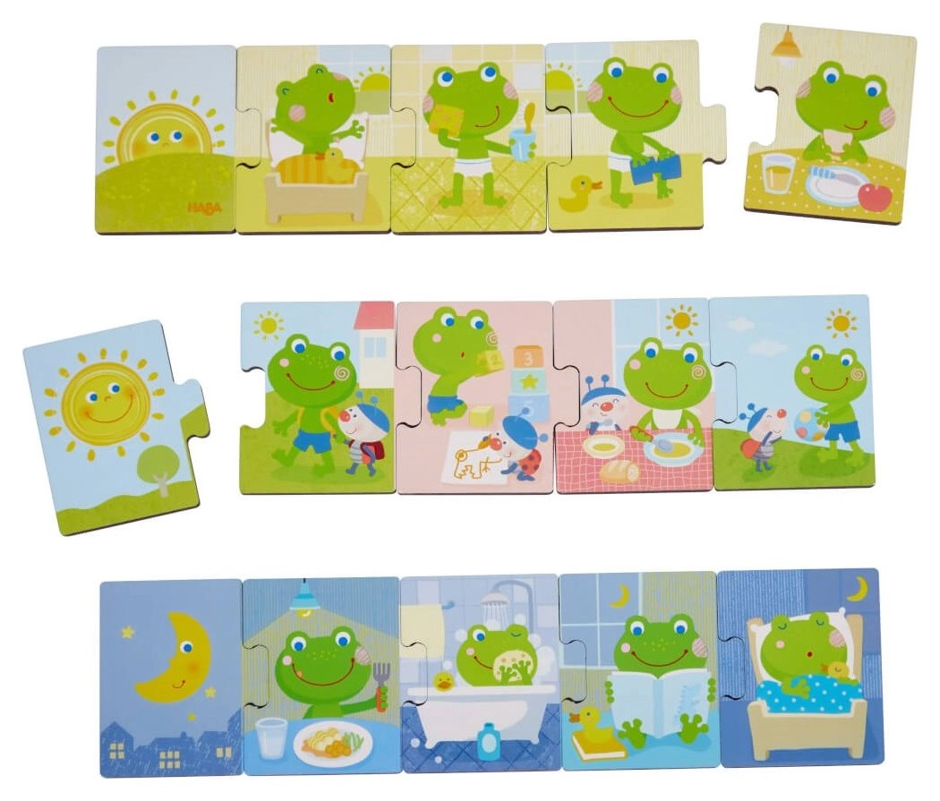 Die Zuordnungspuzzles aus Holz „Froschtag“ von Haba zeigen drei liebevolle Szenen aus dem Alltag des Frosches. Jedes Puzzle hat 5 passgenau gearbeitete Teile, die sich dank ihrer Größe und Stabilität auch von den Kleinsten hervorragend zusammensetzen lassen. Die farbenfrohen Illustrationen laden zum Erzählen und zum gemeinsamen Spiel von Eltern und Kindern ein.