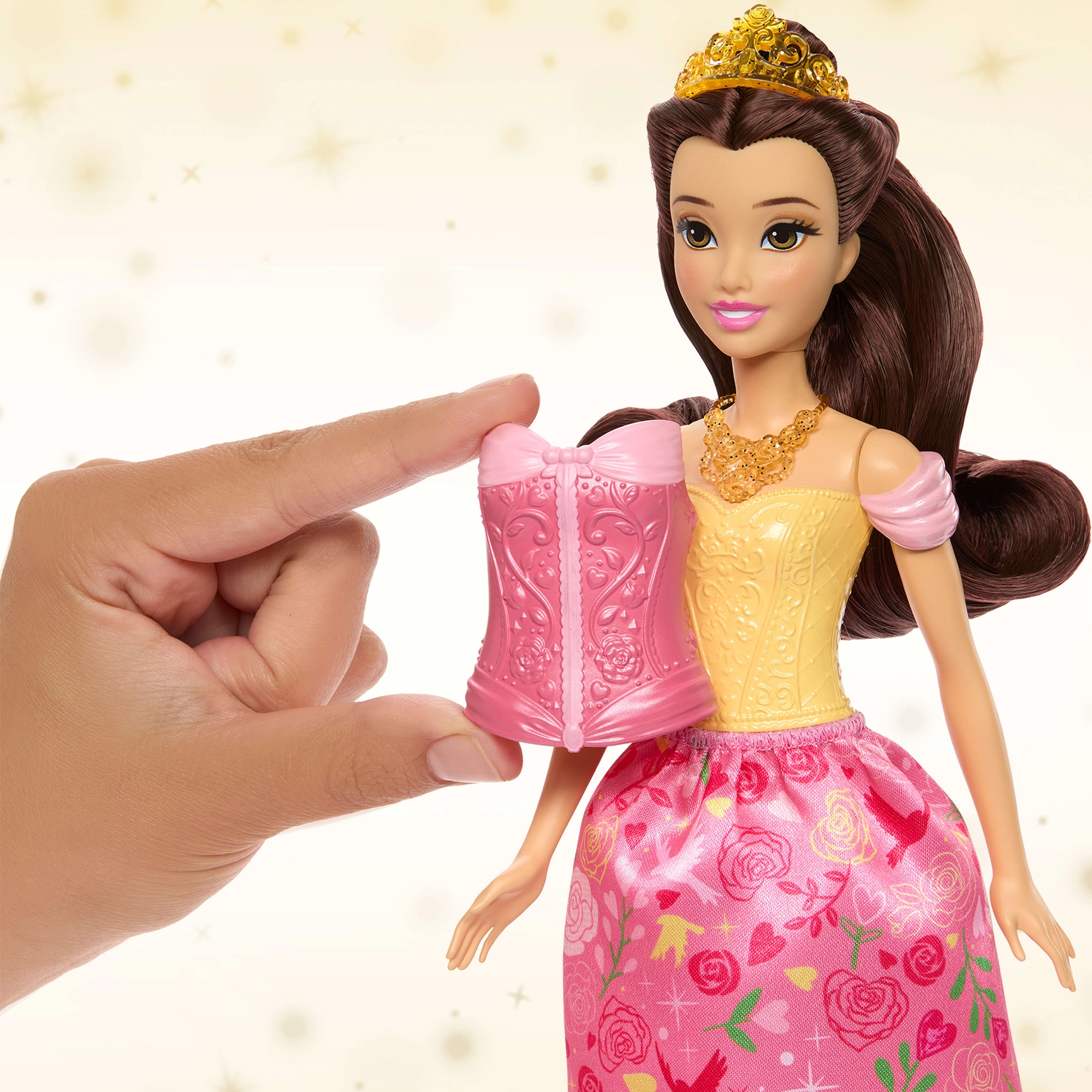 Die Puppe ermöglicht einen einfachen Look-Wechsel – einfach Korsett und Rock tauschen und aus einem Nachmittagstreffen wird im Handumdrehen ein zauberhafter Ball. Das lange Haar kann gekämmt und mit der Tiara geschmückt werden, Accessoires fördern Rollenspiele und dank der Gelenkpunkte posiert Belle wunderschön bei jedem Abenteuer.