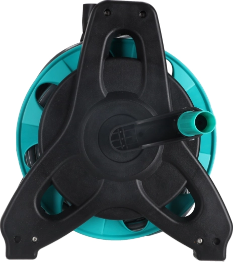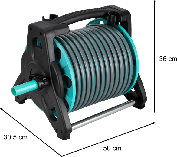 Der stabile Rahmen mit Trommel und Kurbel sorgt für schnelles Aufwickeln und platzsparende Aufbewahrung. Der klappbare Griff spart Platz bei Lagerung und Transport.