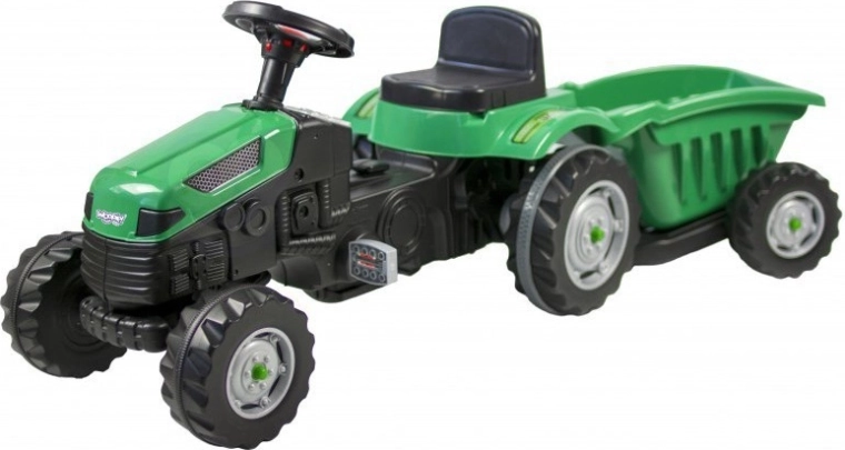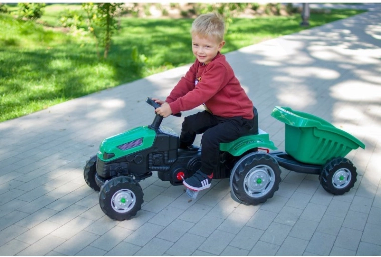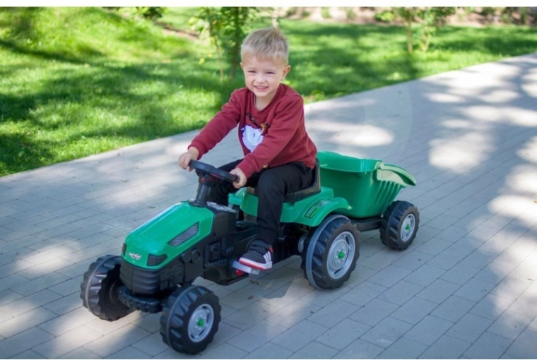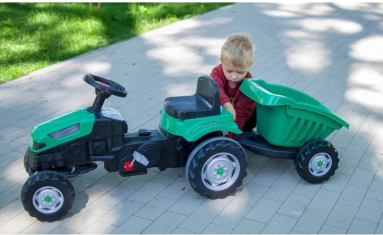 Entdecken Sie einen robusten Kindertraktor mit realistischer Optik, der Motorik und Fantasie fördert. Dank präziser Lenkung, Hupe am Lenkrad und pendelnder Vorderachse ist das Manövrieren auch für kleinere Kinder leicht. Der abnehmbare Anhänger/die Mulde ermöglicht den Transport von Spielzeug, Sand oder Ästchen – ideal für kleine Gärtner.