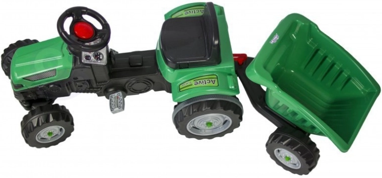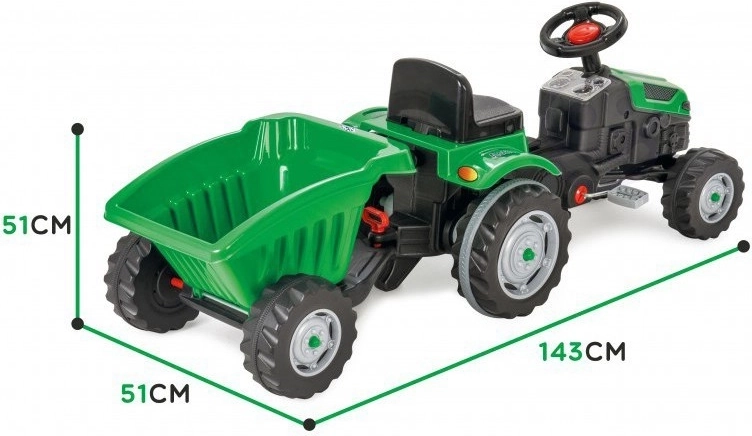 Der Traktor besteht aus hochwertigen, strapazierfähigen und gesundheitlich unbedenklichen Materialien, die umweltfreundlich sind. Der Kettenantrieb sorgt für eine sanfte und komfortable Fahrt, während die leisen Räder auch bei längeren Fahrten nicht stören. Ein Haken zum Ziehen ermöglicht das Anschließen weiteren Zubehörs.