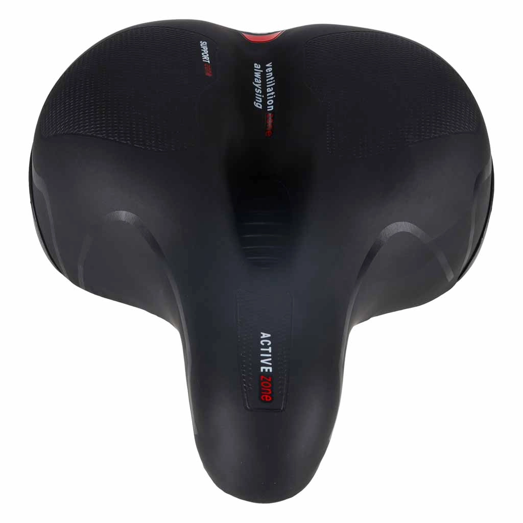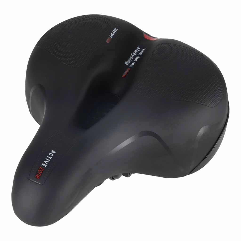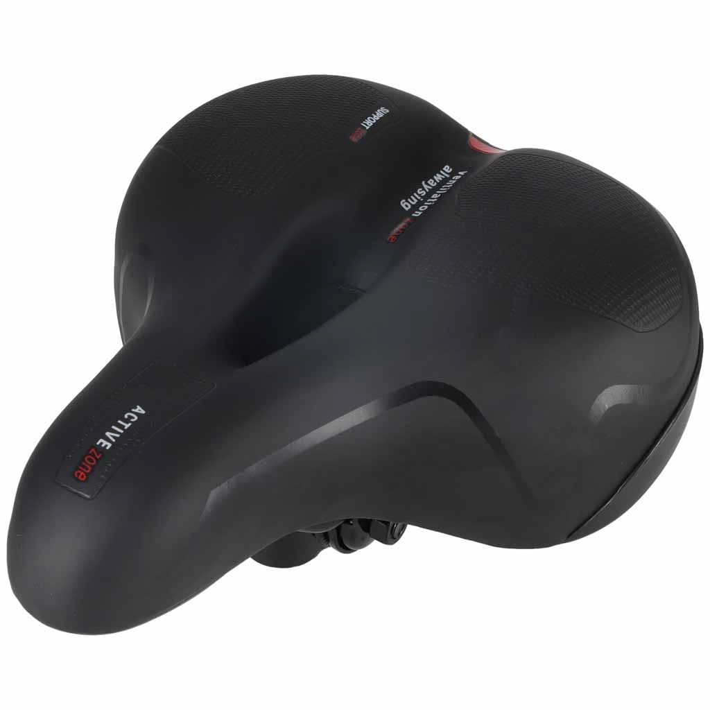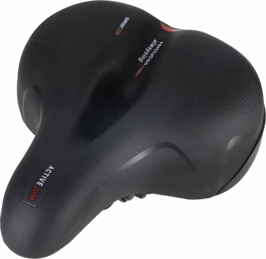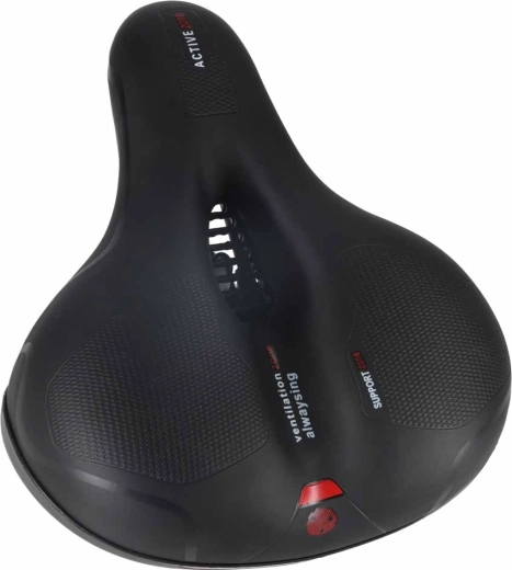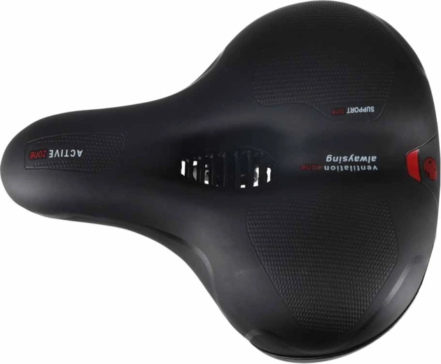 Bequemer Fahrradsattel für Stadt- und Trekkingfahrten mit breiter ergonomischer Form, elastischer Schaumfüllung und doppelter Federdämpfung für eine sanfte Fahrt ohne Druckstellen. Dank zentralem Belüftungskanal bleibt der Sattel atmungsaktiv, die wasserabweisende Oberfläche aus PU-Leder trotzt Regen und der integrierte hintere Reflektor erhöht die Sichtbarkeit in der Dämmerung.