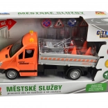 Dieser orangefarbene Lkw mit Ladeplattform und klappbaren Rampen bietet Kindern ein authentisches Erlebnis städtischer Dienste und Straßenarbeiten. Der Schwungradantrieb gewährleistet eine sanfte Fahrt ohne Batterien, während realistische Details und Zubehör die Fantasie sowie die Feinmotorik fördern.