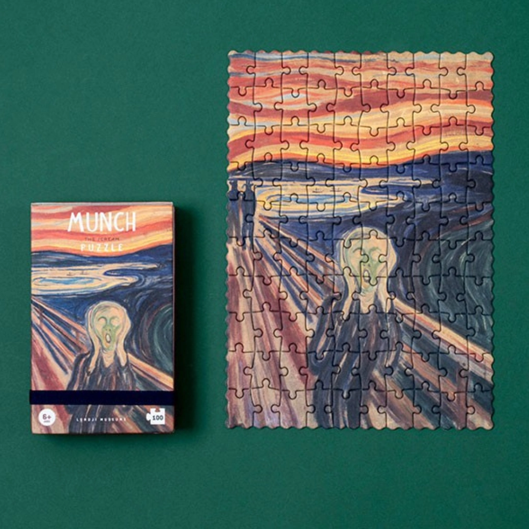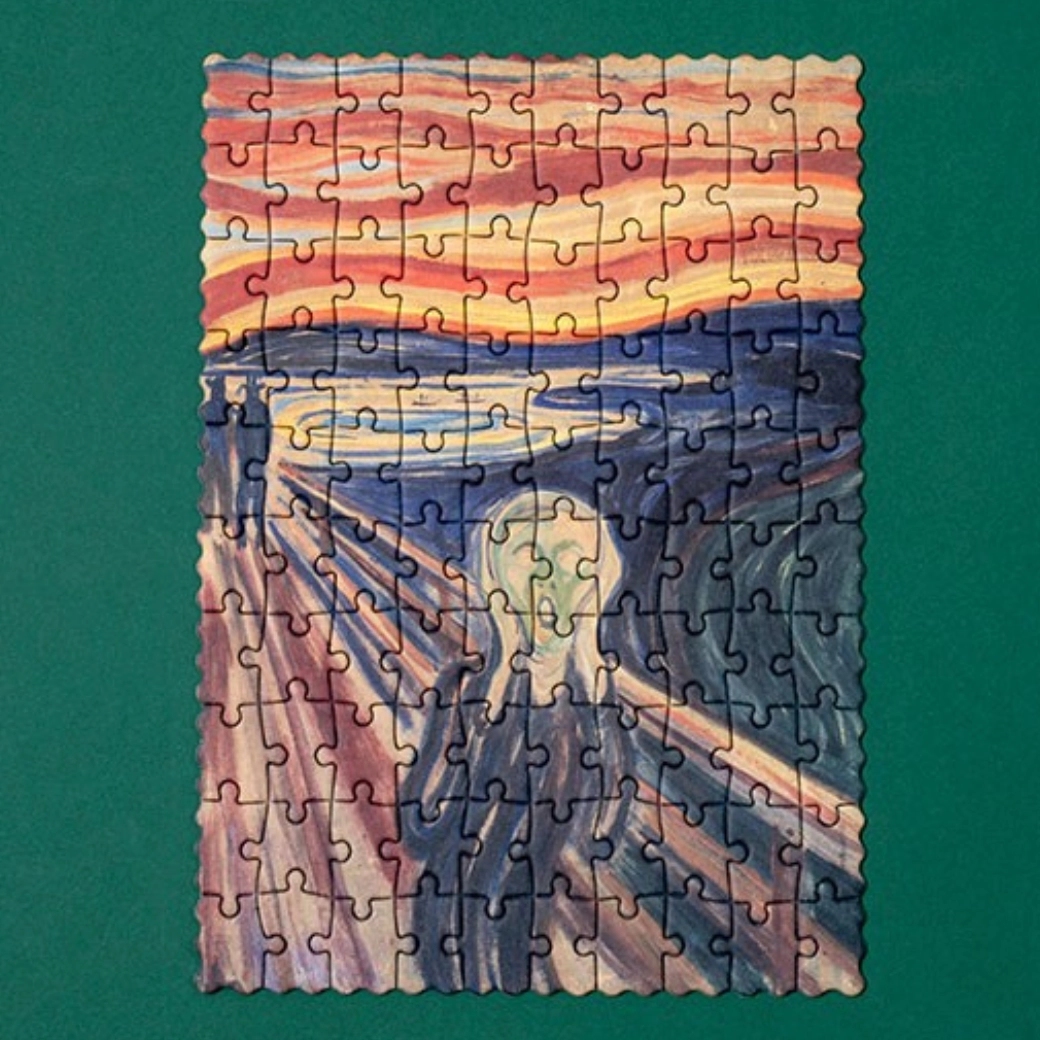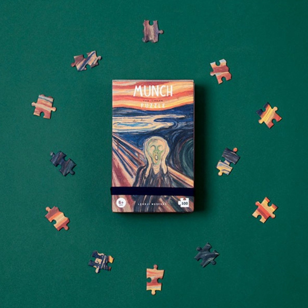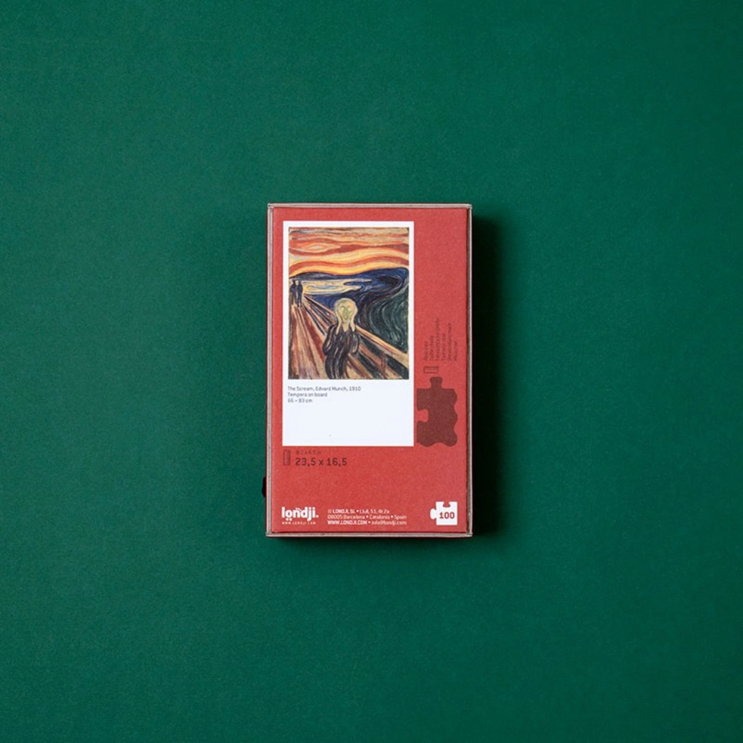 Taschenpuzzle mit dem ikonischen Motiv Der Schrei bietet 100 stabile Teile im kompakten Format – ideal für unterwegs und für ruhige Konzentrationsmomente. Perfekt als kleines Geschenk, trainiert Geduld und visuelle Wahrnehmung.