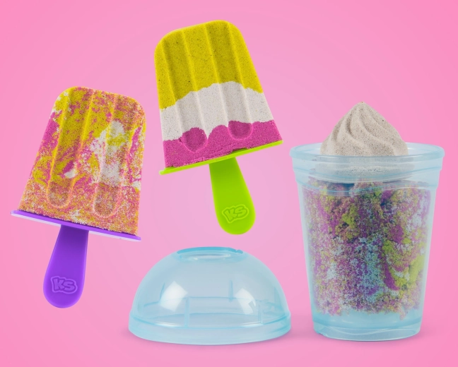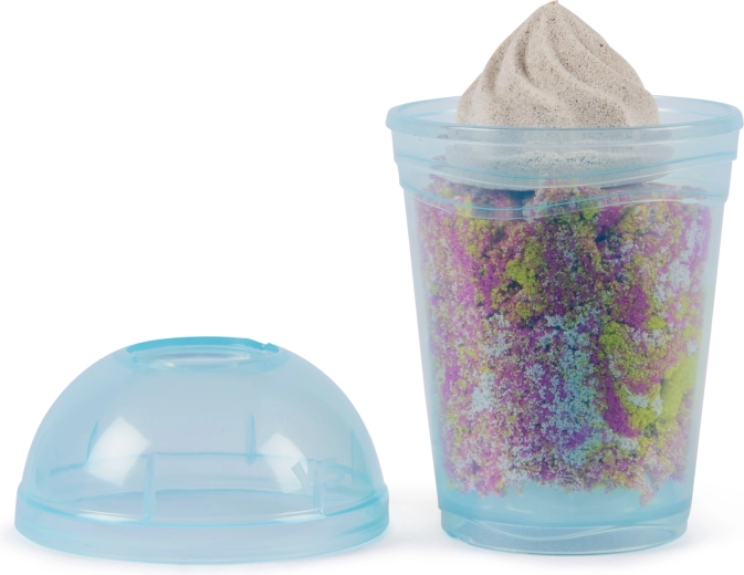 Mit dem Kinetic Sand Smoothie-Mixer lernen Kinder Farben zu mischen und „Getränke“ sowie „Desserts“ in Bechern oder Eisformen zu schichten. Einfach Sand in den Deckel des Mixers füllen, von Hand kurbeln und beobachten, wie neue Farbtöne und realistische Texturen entstehen. Der kinetische Sand wirkt wie nass, doch die Hände bleiben trocken und die Arbeitsfläche sauberer.