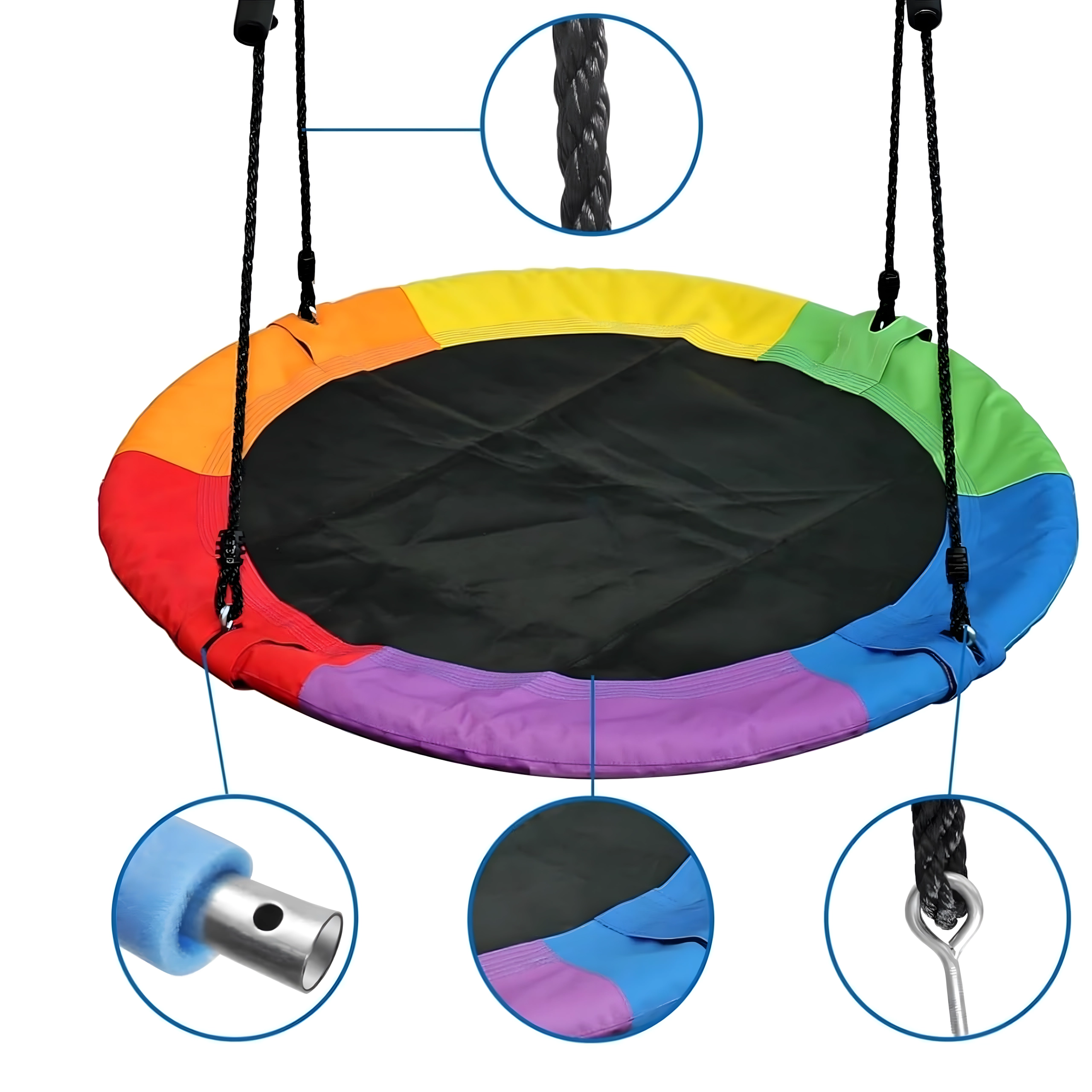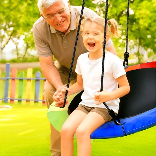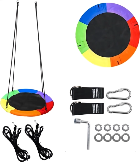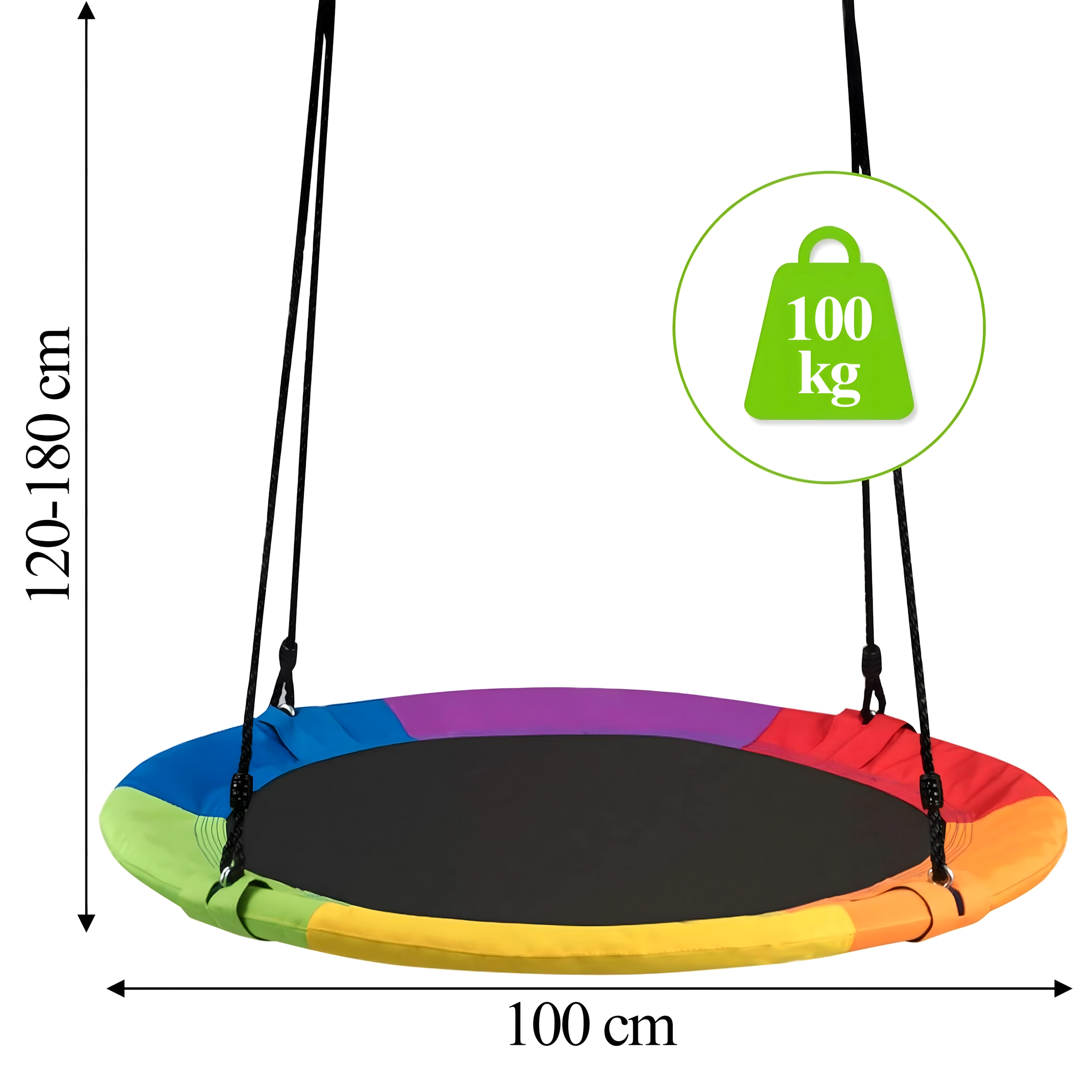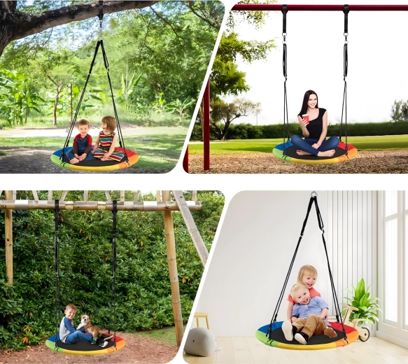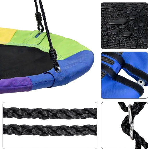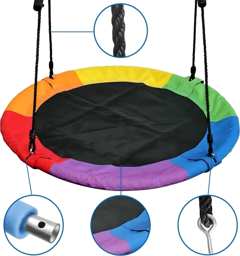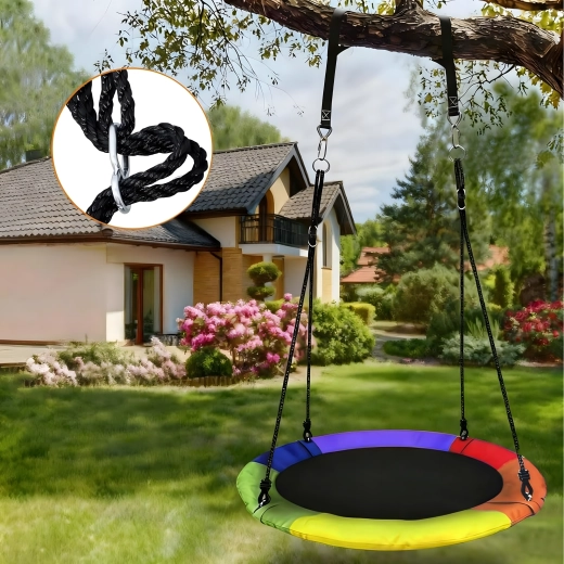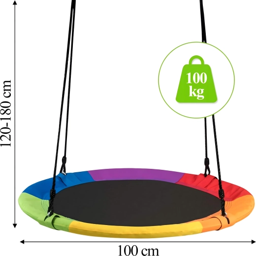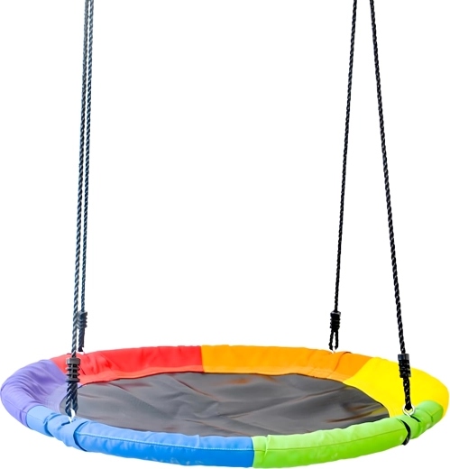 Entdecken Sie ein stabiles und bequemes Storchennest mit 100 cm Durchmesser, das Ihren Garten in einen beliebten Spielplatz verwandelt. Der weich gepolsterte Rand, die strapazierfähige Sitzfläche und die vierpunkt-Aufhängung sorgen für Komfort und Sicherheit. Die Schaukel ist für den Außen- und Innenbereich geeignet, lässt sich leicht montieren und überzeugt durch einen farbigen Rand.