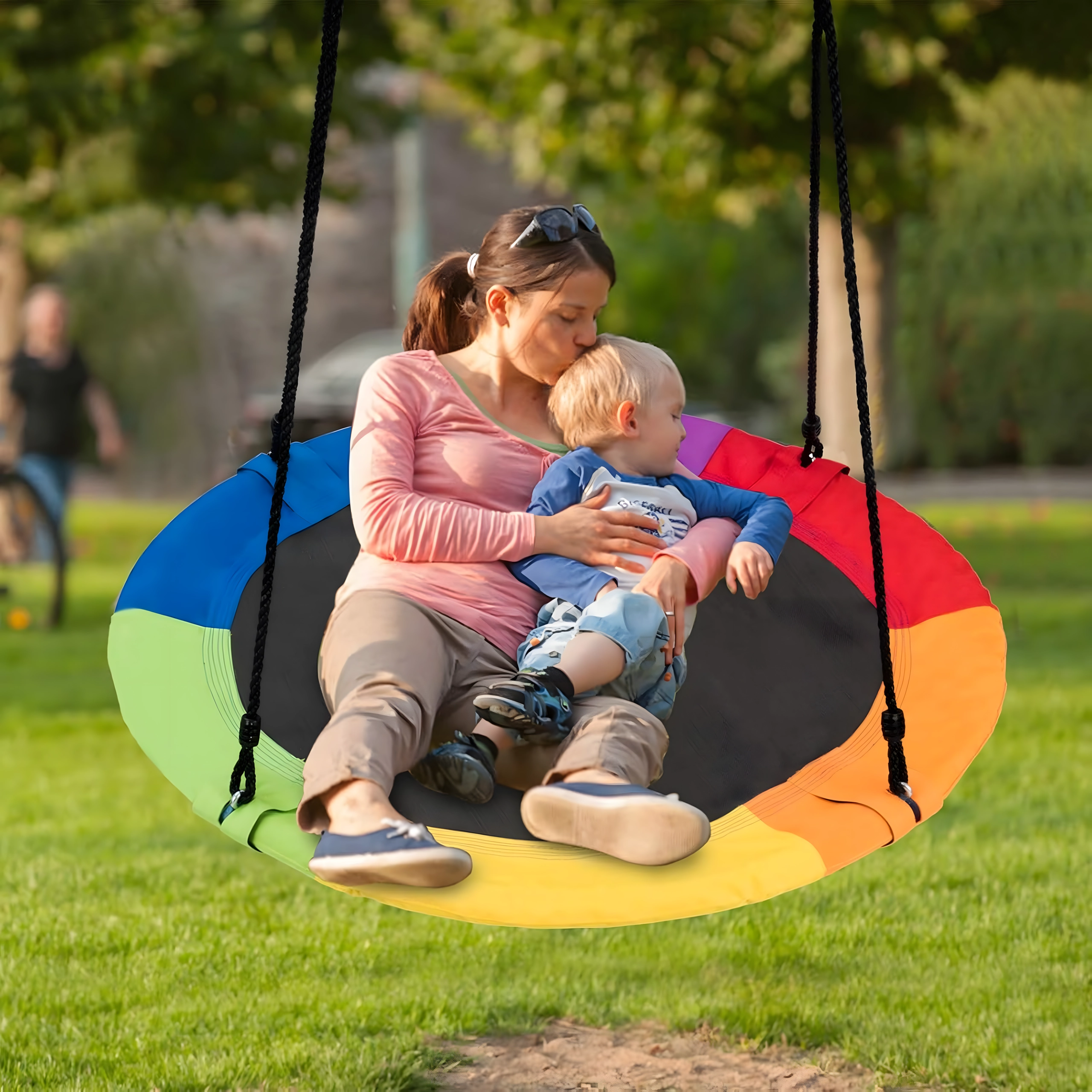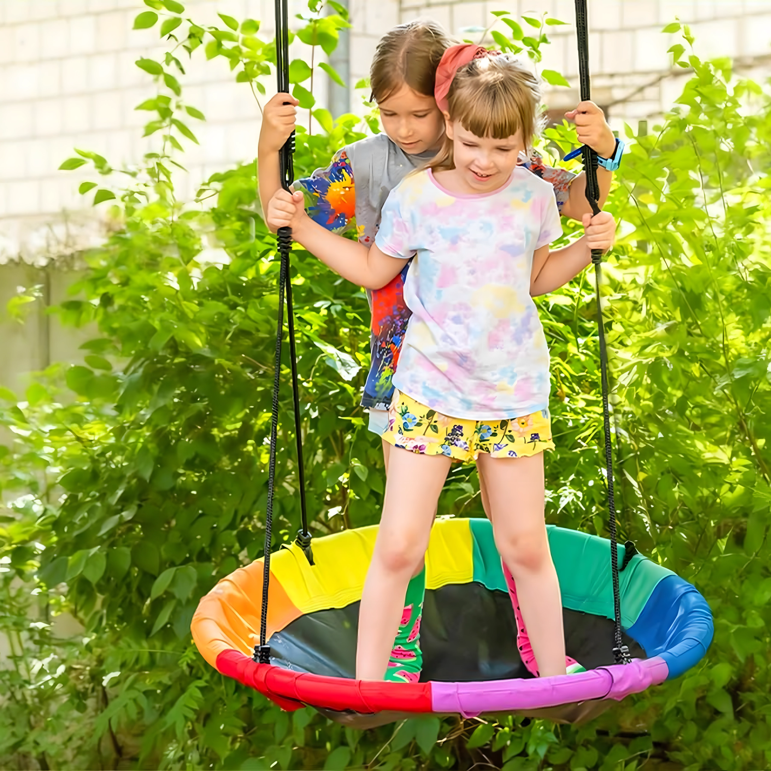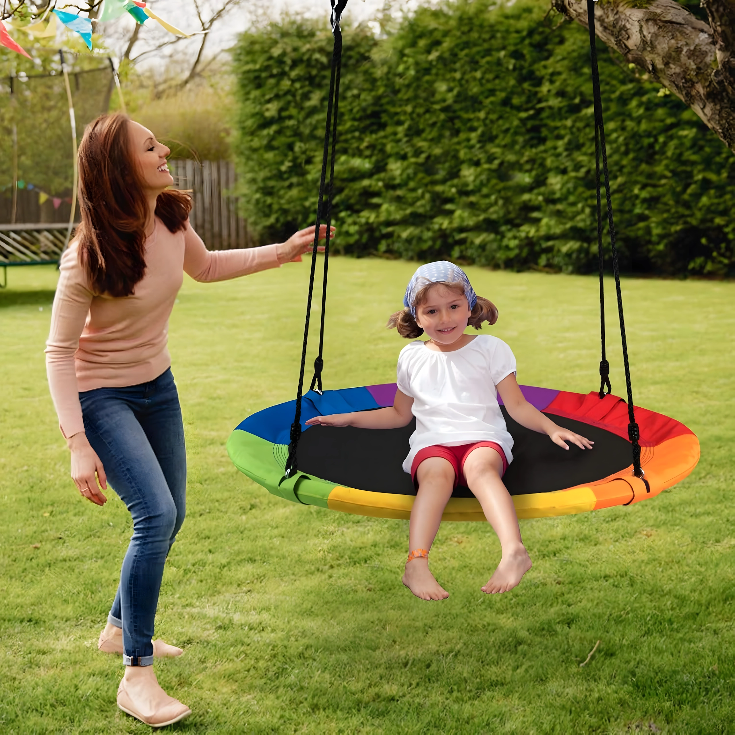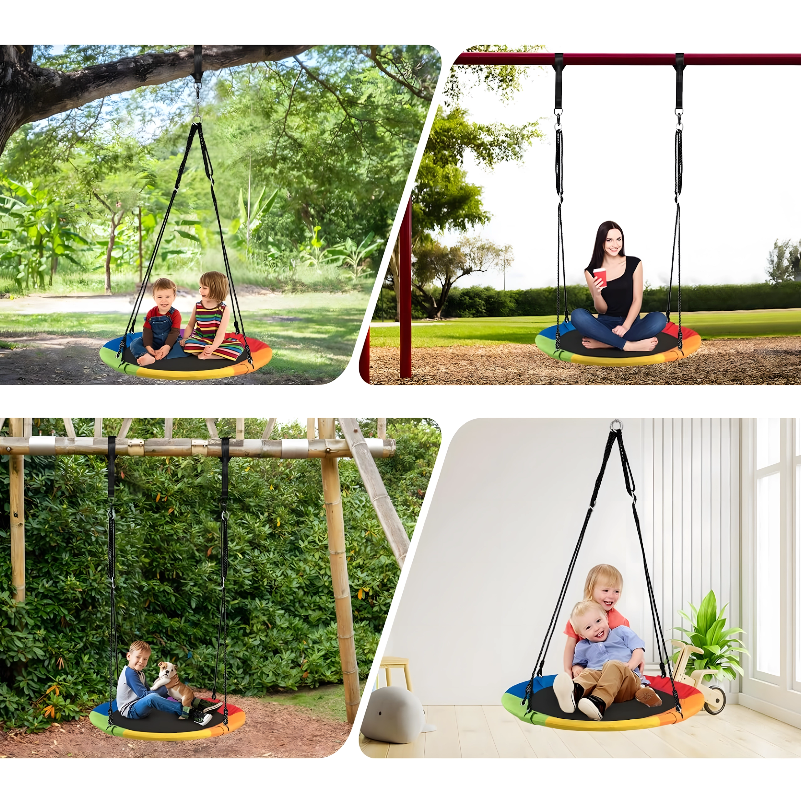 Entdecken Sie ein stabiles und bequemes Storchennest mit 100 cm Durchmesser, das Ihren Garten in einen beliebten Spielplatz verwandelt. Der weich gepolsterte Rand, die strapazierfähige Sitzfläche und die vierpunkt-Aufhängung sorgen für Komfort und Sicherheit. Die Schaukel ist für den Außen- und Innenbereich geeignet, lässt sich leicht montieren und überzeugt durch einen farbigen Rand.