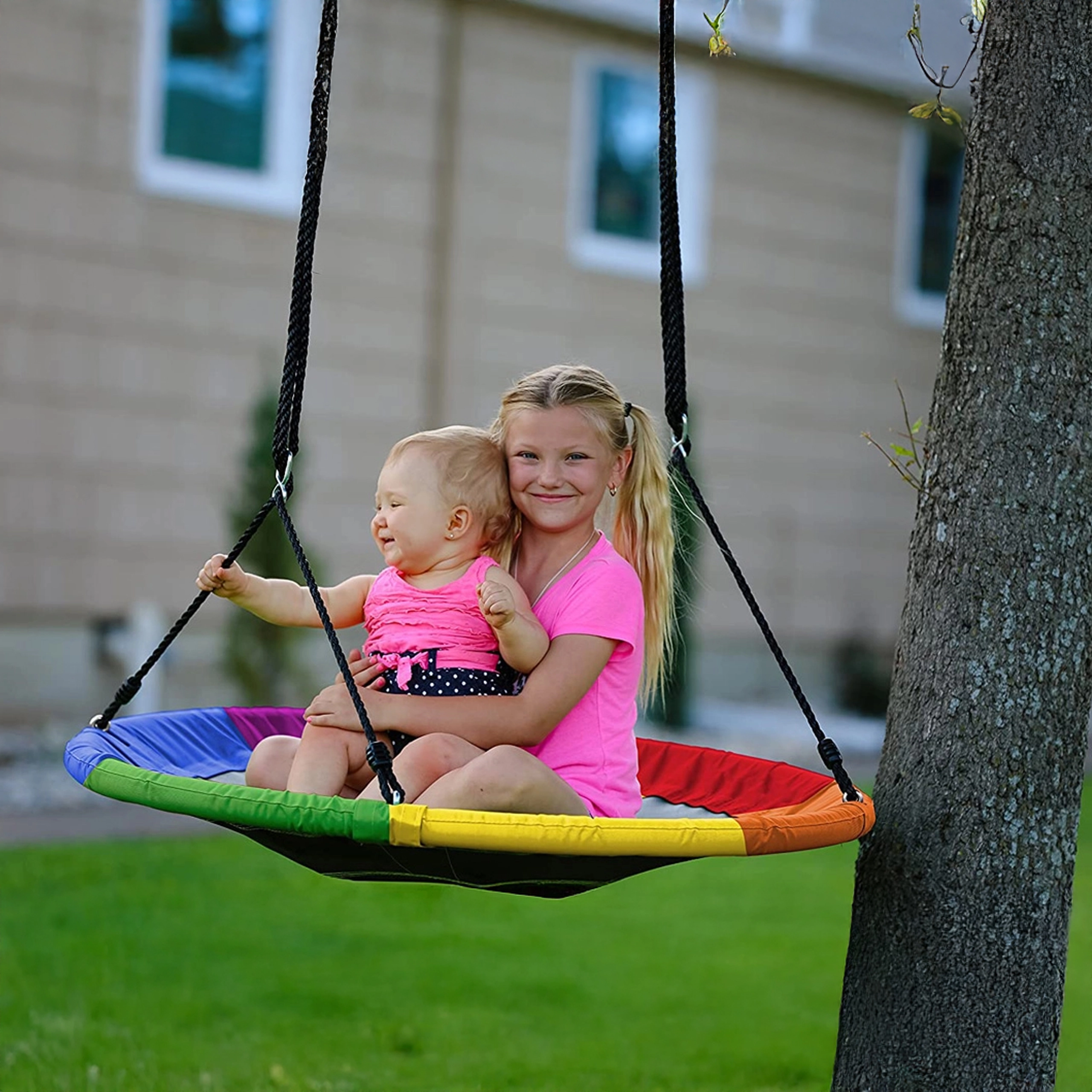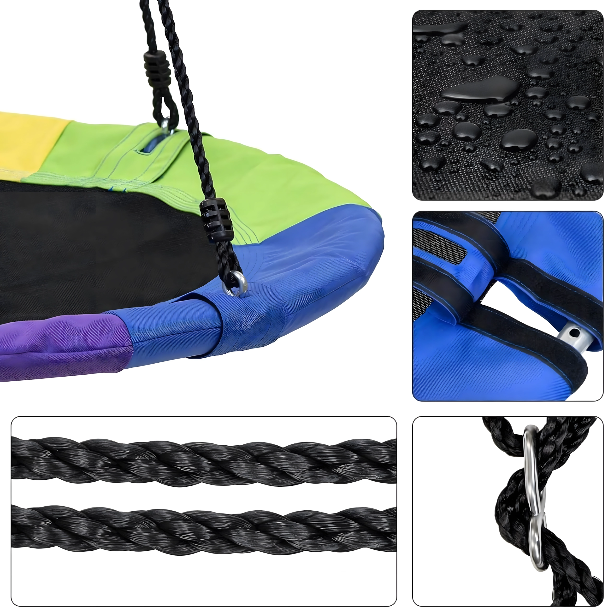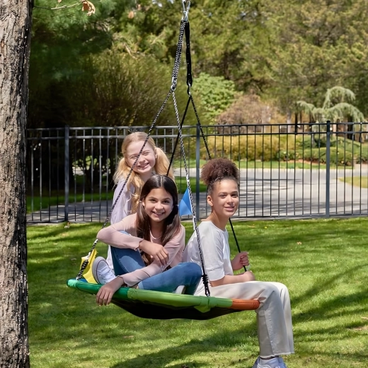 Im Paket ist alles Nötige enthalten: verstellbare Baumriemen, Karabiner und ein Montageset. Der robuste Stahlrahmen mit Schaumstoffpolster, verstärkte Nähte und wasserabweisender Stoff halten täglichem Spielen und verschiedenen Witterungsbedingungen stand.