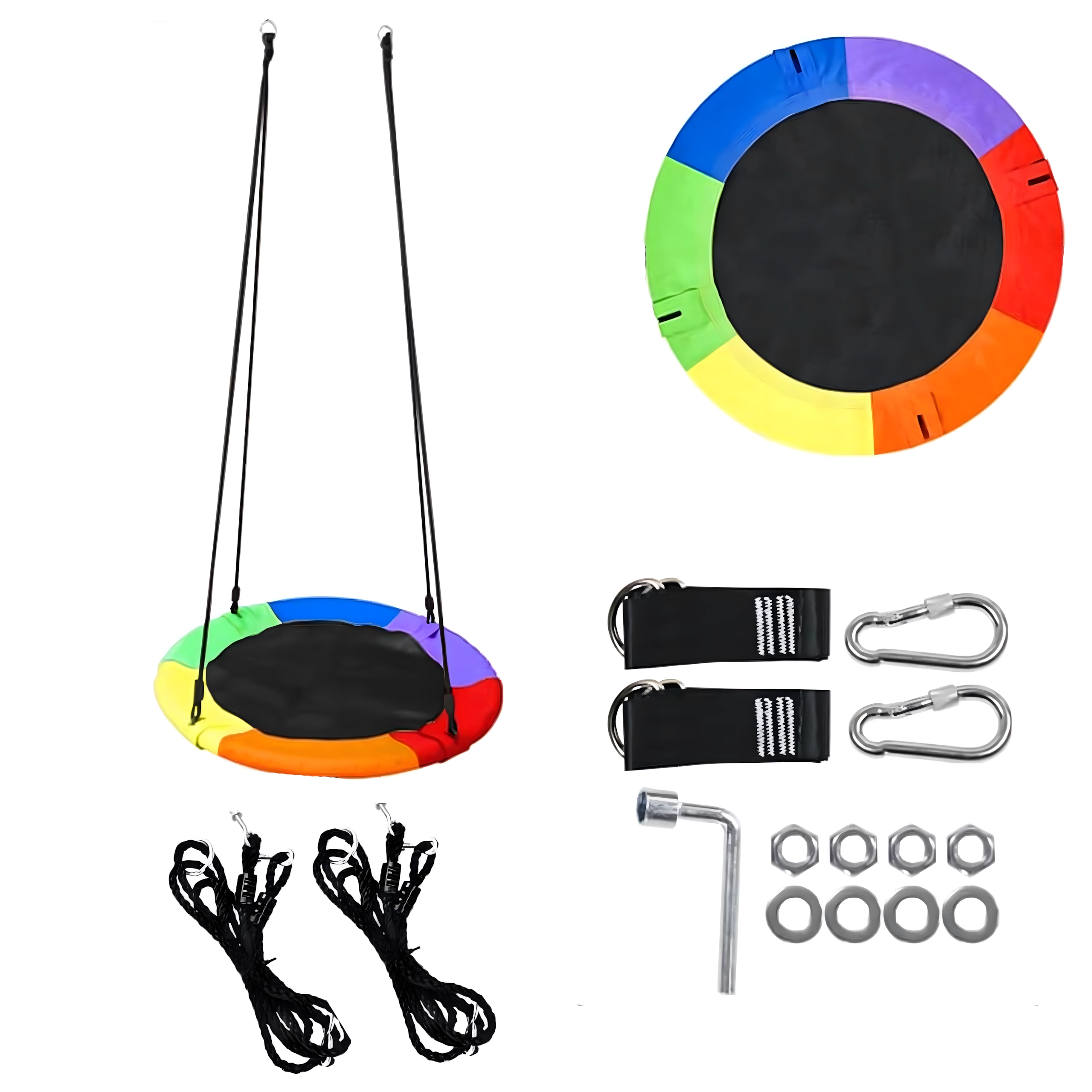 Im Set enthalten sind Baumriemen und Metallkarabiner, mit denen Sie die Schaukel schnell und sicher aufhängen.