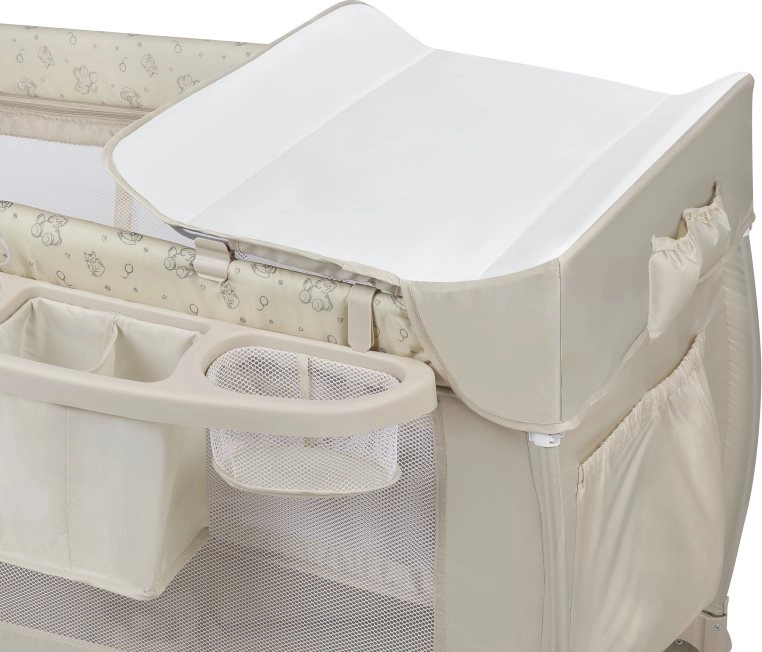 Die integrierte Wickelauflage und das Seitenpanel mit 3 Taschen halten Windeln, Feuchttücher und Kleinigkeiten übersichtlich griffbereit – für schnelles Wickeln jederzeit und überall.