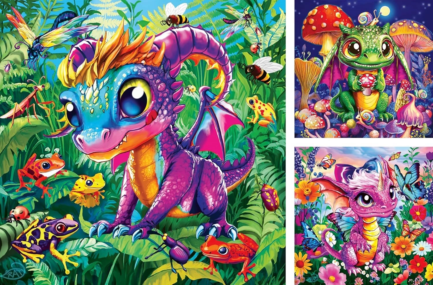 Das RAVENSBURGER Kinderpuzzle-Set bietet drei hübsche Illustrationen von kleinen Drachen, die die Natur entdecken. Jedes Bild mit 49 Teilen begeistert durch leuchtende Farben, passgenaue Stanzung und eine angenehme Oberfläche. Dank des kleineren Formats ist das Puzzeln eine schöne Herausforderung für Kinder, die einfachere Puzzles bereits beherrschen und den nächsten Schritt machen möchten.