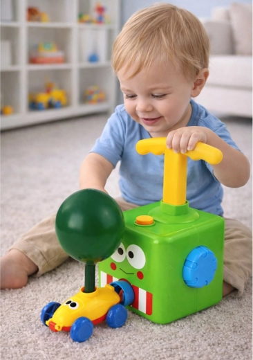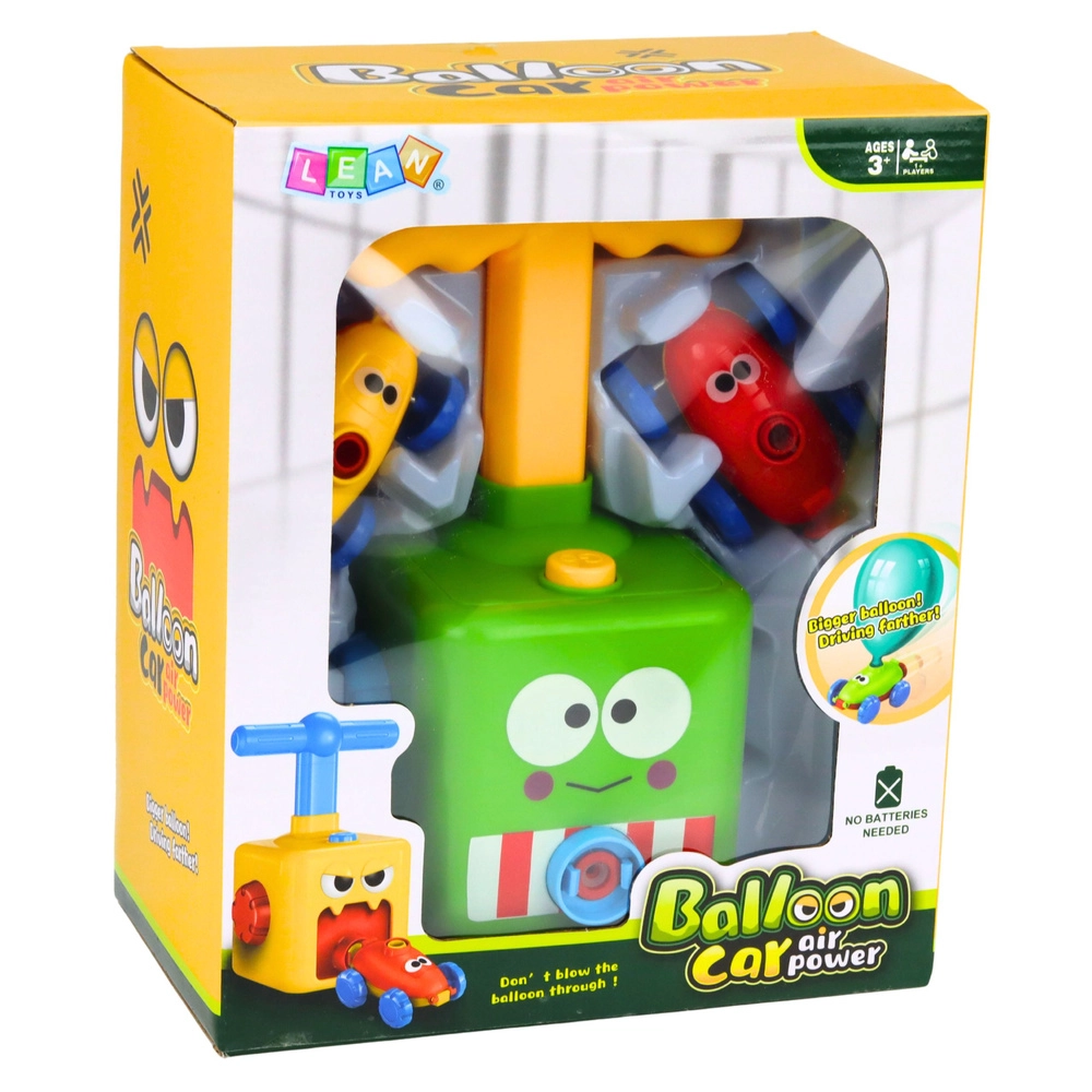 Das Ballonauto-Set mit einer Station in Froschform zeigt Kindern, wie Druckluft ein Fahrzeug in Bewegung setzen kann. Einfach den Ballon aufstecken, mehrmals pumpen und das Auto startet – ohne Batterien, nur mit der Kraft der Luft.