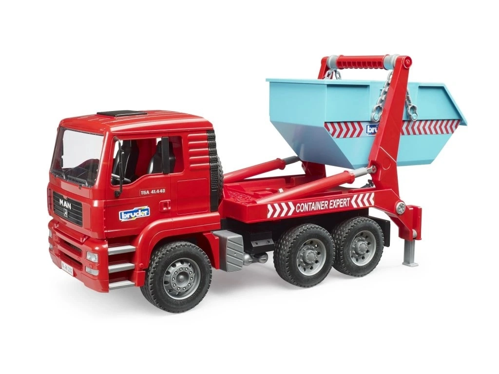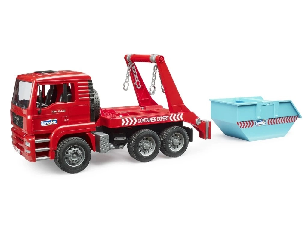Das praktische System mit Ketten ermöglicht das einfache Auf- oder Absetzen des Containers, sodass das Fahrzeug sofort zum nächsten „Einsatz“ starten kann. Perfekt für dynamisches Baustellenspiel.