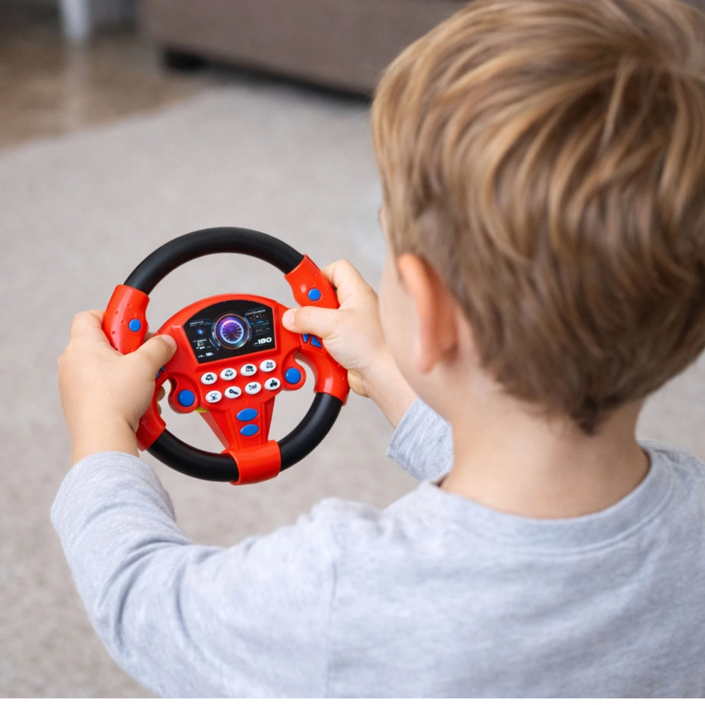 Das interaktive Kinderlenkrad in sattem Rot ermöglicht es Kindern, echtes Fahren nachzuahmen. Drehbares Lenken, Hupe und verschiedene Fahrzeugsoundeffekte ziehen ins Spiel hinein und fördern die Fantasie. Saugnäpfe sorgen für einen stabilen Halt auf glatten Oberflächen, sodass sich das Lenkrad beim Spielen nicht verschiebt.