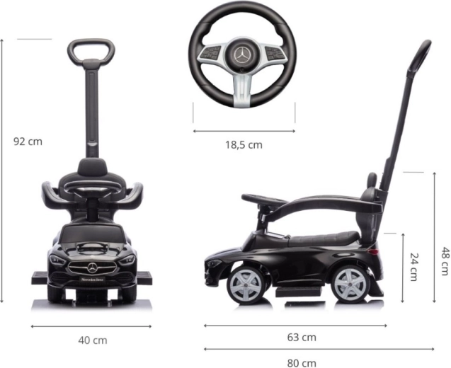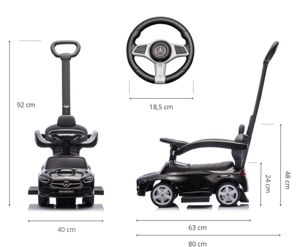 Die Miniatur‑MERCEDES C‑Class überzeugt mit präzisen Details – Frontpartie, Leuchten und Emblemen – und lässt Kinder wie in einem echten Auto fühlen. Das Laufrad vereint Komfort, Stabilität und Funktionalität: Weicher Sitz mit Rückenlehne, Schutzbügel und rutschfeste Fußstützen sorgen für eine ruhige Fahrt, während Eltern Richtung und Tempo mithilfe der hohen Schiebestange sicher steuern können.