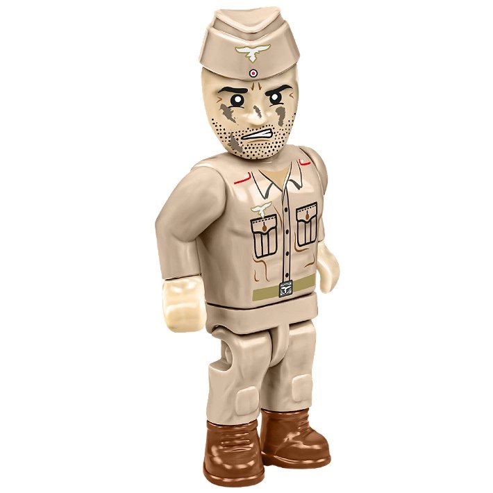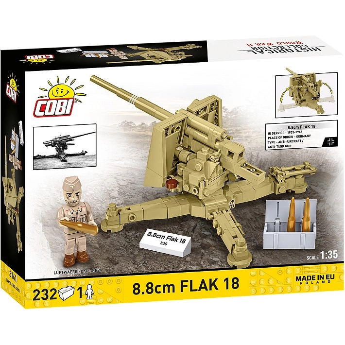 Das Modell ist sowohl zum Ausstellen als auch für dynamische Szenen konzipiert: Das Rohr lässt sich heben, das Geschütz dreht sich um 360°, die Stützen sind klappbar und die Handräder funktionieren. Enthalten sind eine Artillerist-Figur in sandfarbener Uniform, Munition, Transportkiste und eine weiße Sammlerplakette mit Name und Maßstab.