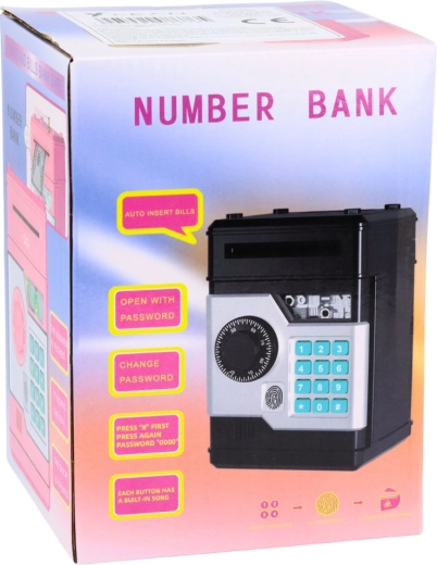 Die moderne Spardose im Tresor-Look ist ideal für Kinder, die den Umgang mit Geld lernen. Nach dem Einführen einer Banknote wird sie automatisch eingezogen, Münzen fallen durch die obere Öffnung hinein. Nach Eingabe des vierstelligen PINs öffnet sich die Tür; bleibt sie offen, erinnert die Spardose nach ca. 20 s daran, sie zu schließen.
