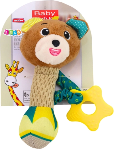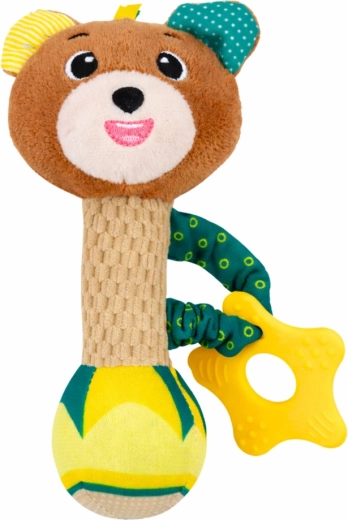 Das Plüschbärchen ist als sichere und unterhaltsame sensorische Spielzeugrassel für Säuglinge ab den ersten Lebensmonaten konzipiert. Im Inneren verbirgt sich eine sanft klingende Rassel, im Körper eine auf Druck reagierende Quietsche, und der befestigte Gummistern – als Beißteil – lindert gereiztes Zahnfleisch. Unterschiedliche Texturen und Farben laden zum Entdecken ein und trainieren den Greifreflex.