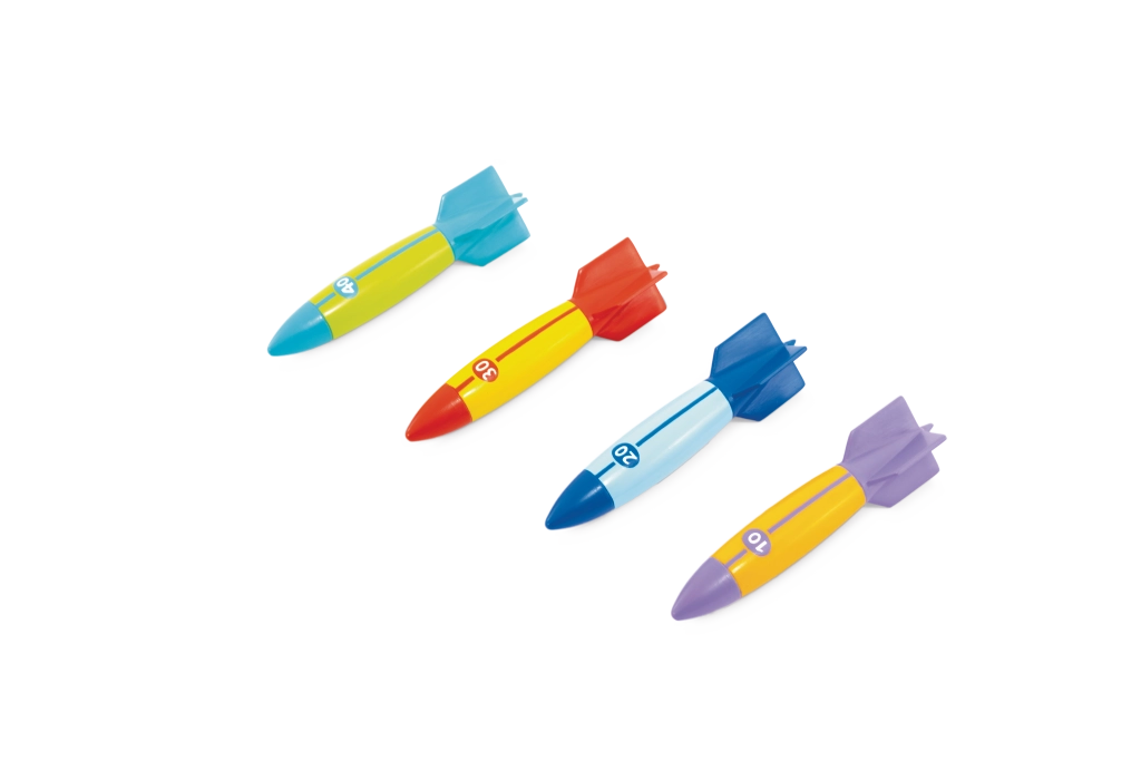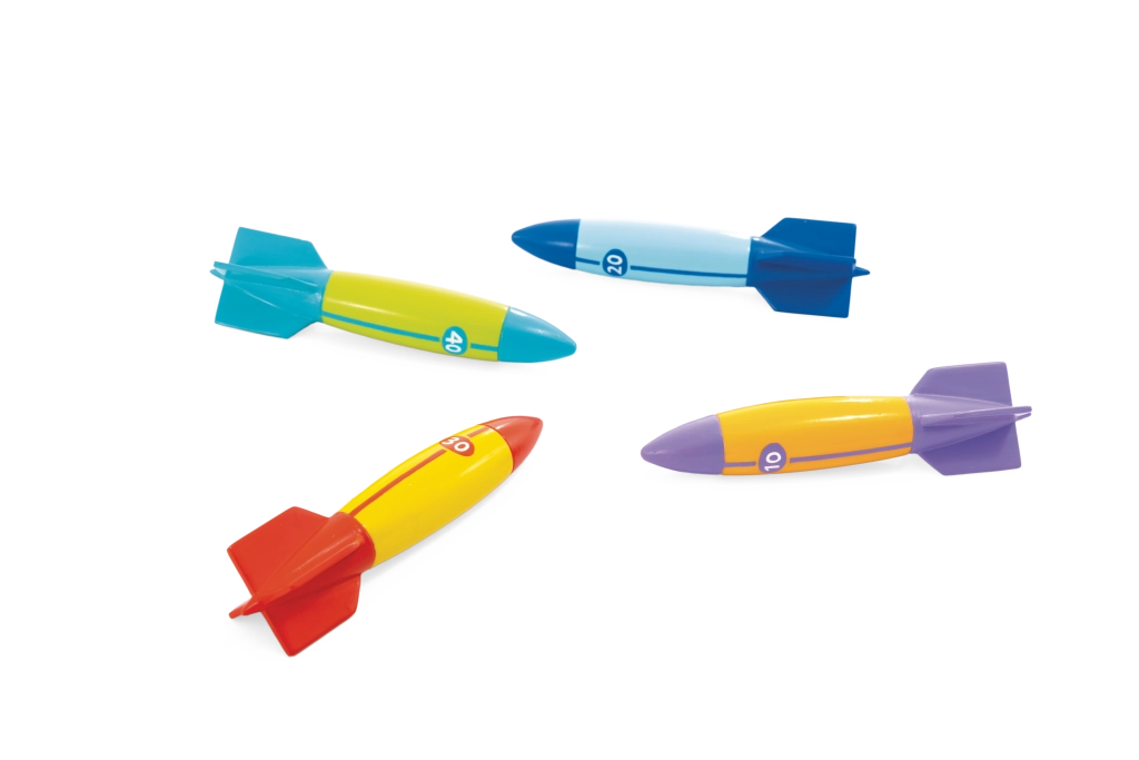 Jedes Torpedo hat auffällige Farben und Zahlenmarkierungen (10/20/30/40) für einfaches Unterscheiden und Punktwertung. Stabilisierungsflügel erleichtern den Griff und die Richtungssteuerung, sodass Kinder unter Wasser längere und präzisere Würfe erzielen – ideal für Wettbewerbe mit Freunden im Pool oder Freibad.
