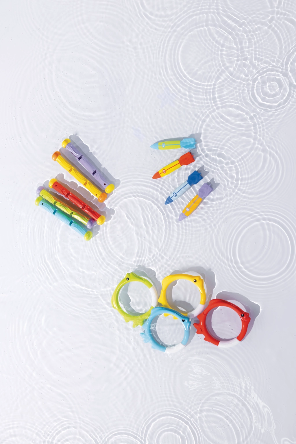 Leuchtende Farben und Zahlenwerte (10/20/30/40) erleichtern das Unterscheiden, Punktesammeln und machen das Tauchen zum spaßigen Wettbewerb.