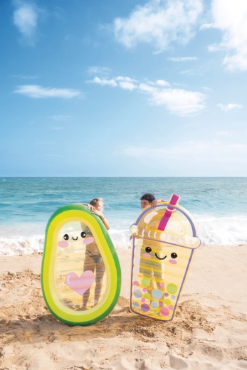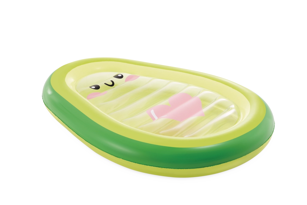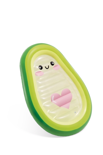 Die aufblasbare Liege Avocado Buddy bringt frischen, avocad-inspirierten Stil in Ihre Sommerentspannung. Der äußere Rand in Grüntönen geht fließend in hellere Nuancen und Gelb über, während der transparente Mittelteil mit einem süßen Comic-Gesicht und rosa Herz der Liege einen originellen Look verleiht. Das robuste transparente PVC eignet sich ideal für Wasserspaß und ermöglicht den Blick unter die Wasseroberfläche.