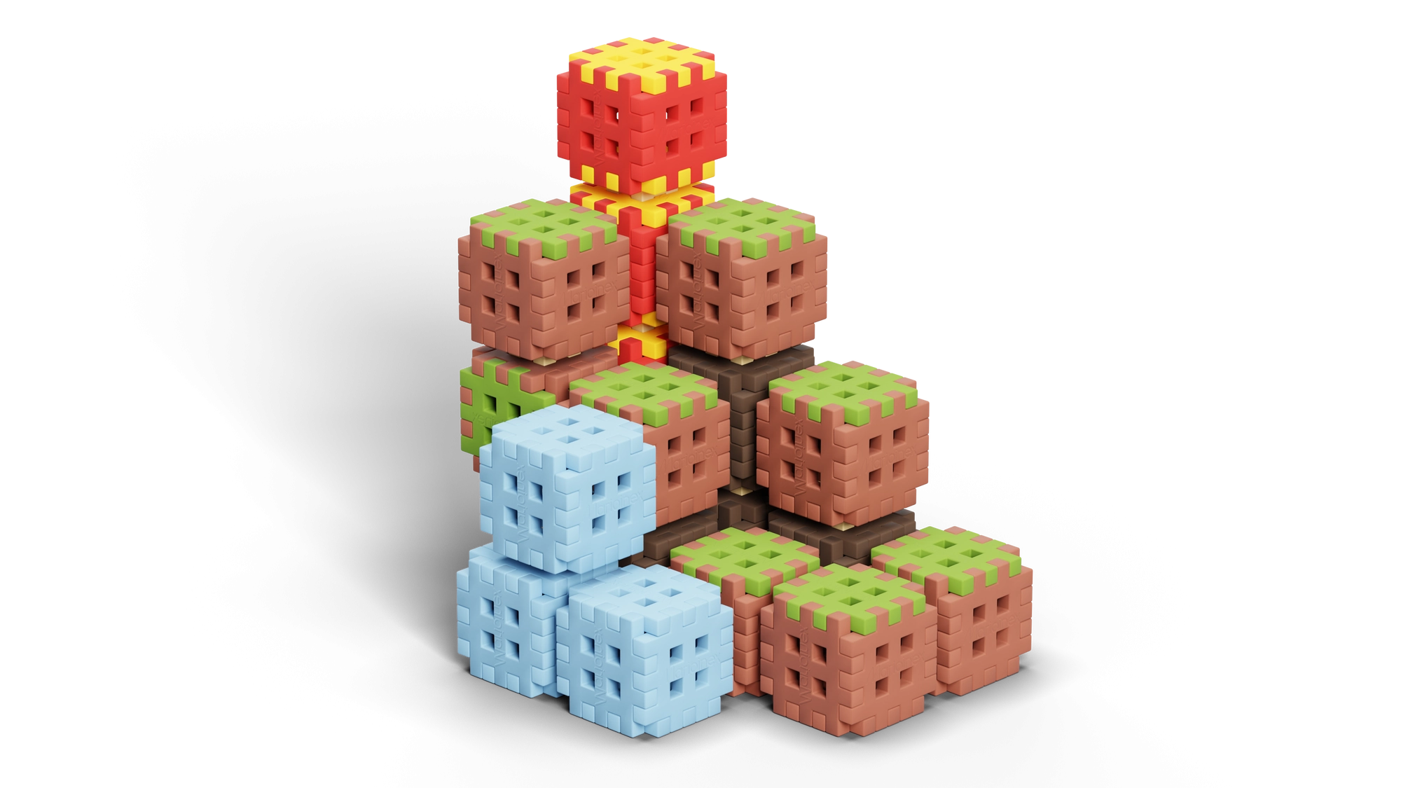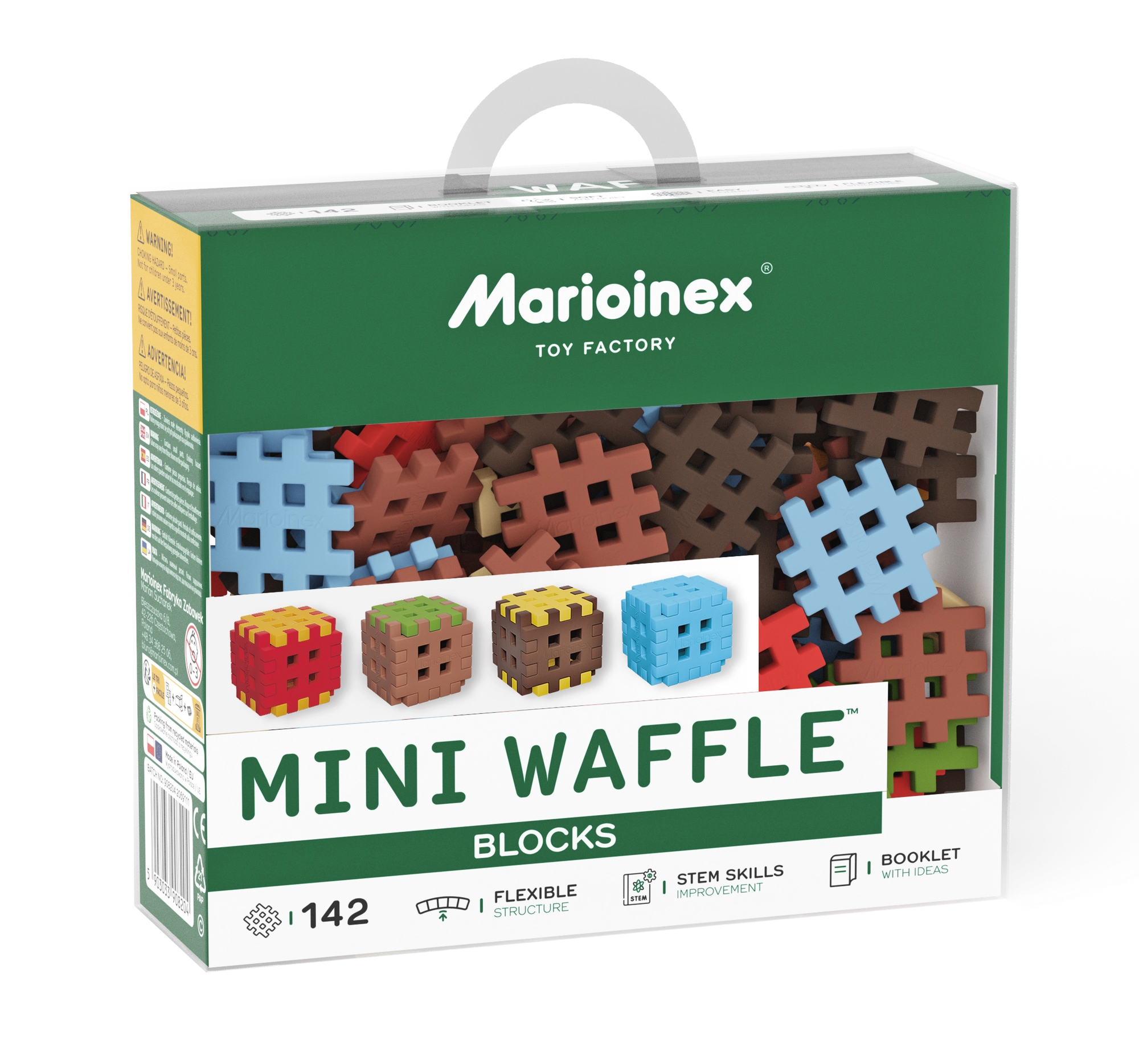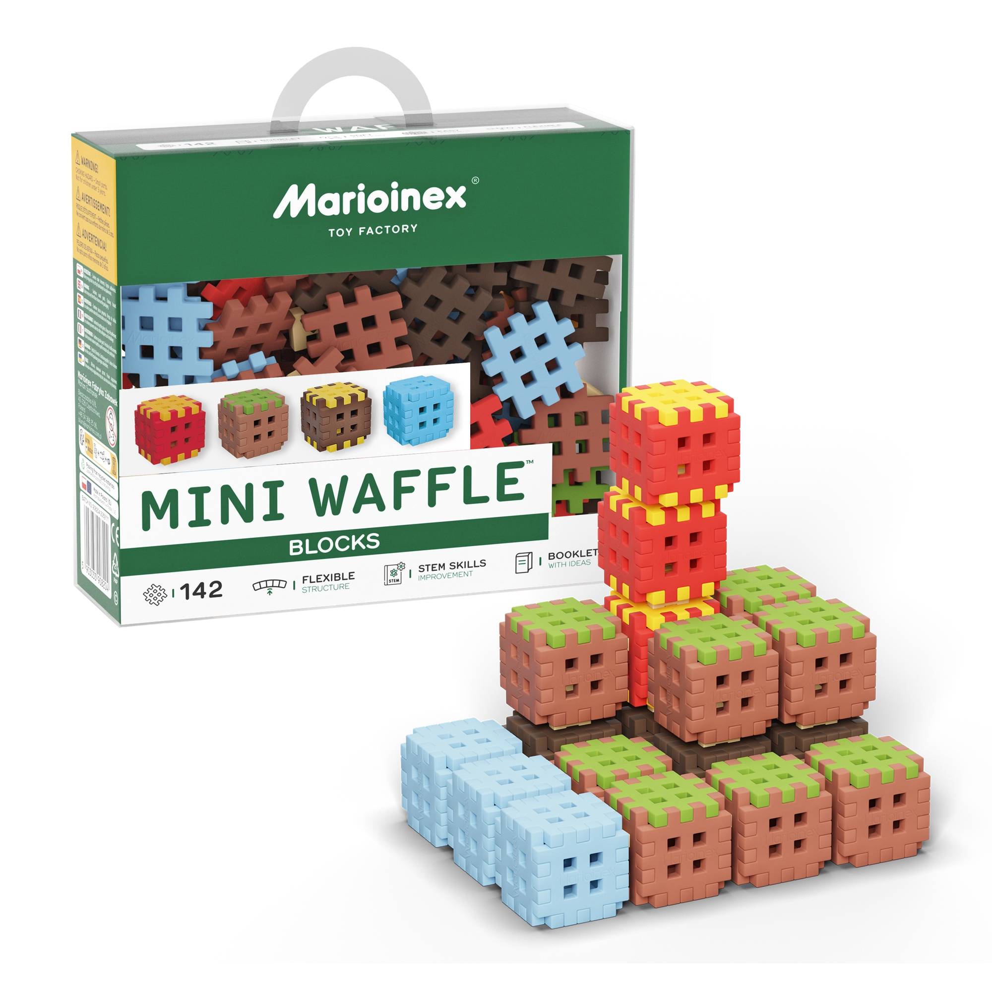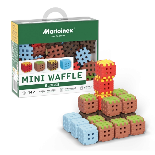 Das Mini Waffle Blocks Set bietet 142 farbige Teile, inspiriert von der Natur – braune „Erde“, grünes „Gras“, eisig-blaue Elemente und energische Rot-Gelb-Akzente. Dank des weichen und flexiblen Materials liegen die Bausteine angenehm in der Hand und lassen sich auch von jüngeren Kindern leicht verbinden.