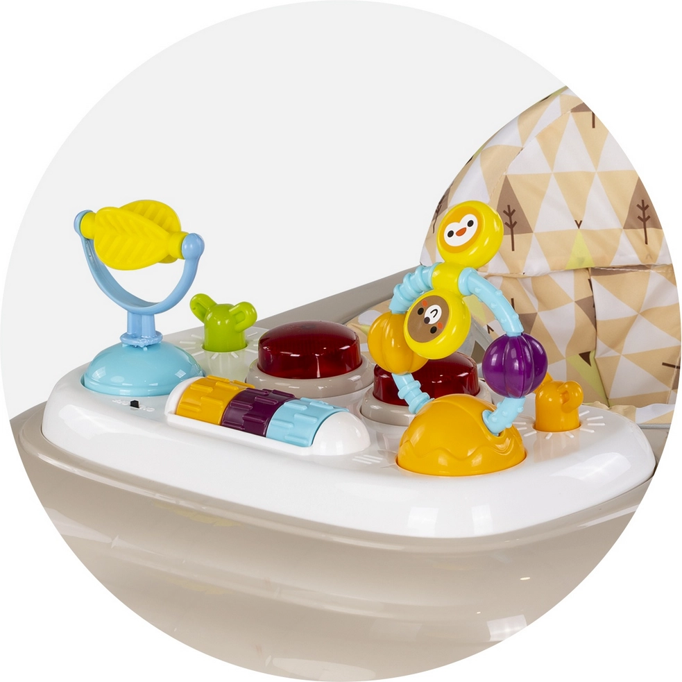 Das interaktive Panel mit buntem Spielzeug, Tasten, Lichteffekten und 12 Melodien unterstützt die Entwicklung der Feinmotorik, der Sinneswahrnehmung und der Koordination. Das Panel ist abnehmbar, sodass das Kind auch außerhalb des Lauflernwagens spielen kann. Die Konstruktion lässt sich leicht zusammenklappen, um Platz zu sparen und den Transport zu erleichtern.