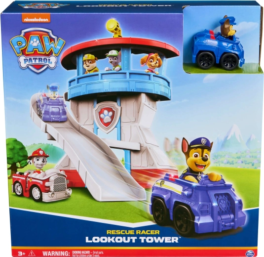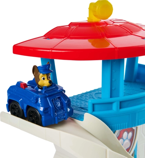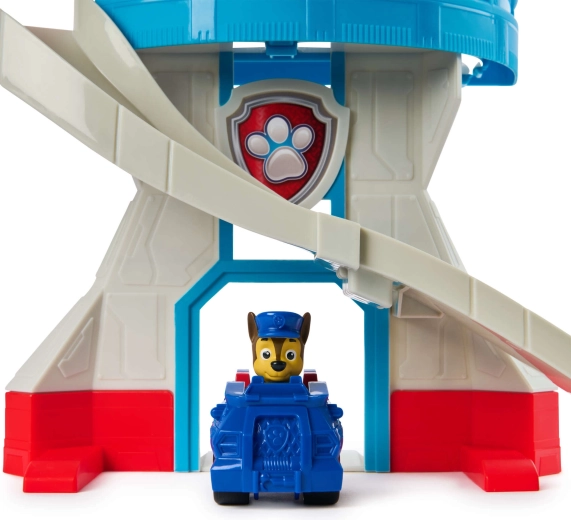Dieses farbenfrohe Spielset, inspiriert von der Serie Paw Patrol, bietet Kindern eine realistische Basis für ihre Rettungsszenarien. Der Turm ist mit dem ikonischen Hundeabzeichen verziert, oben befindet sich ein drehbares gelbes Periskop, mit dem Chase die Umgebung im Blick behalten kann. Ebenfalls enthalten ist ein kompaktes blaues Auto mit Chase-Figur – bereit für die schnelle Abfahrt über die gebogene Rutsche.