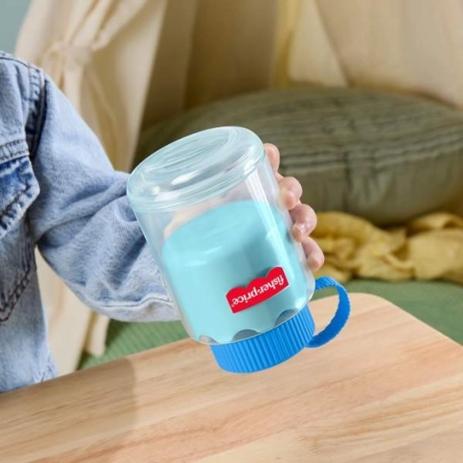 Die Elemente sind für kleine Hände gemacht: ein großer Knopf an der Tasche, ein leicht zu drückender Clip, ein biegsamer „knuspriger“ Snack und eine „Flasche“, die zu Einschenk‑Rollenspielen animiert. Alle Teile passen in den Rucksack – ideal für zu Hause und unterwegs.