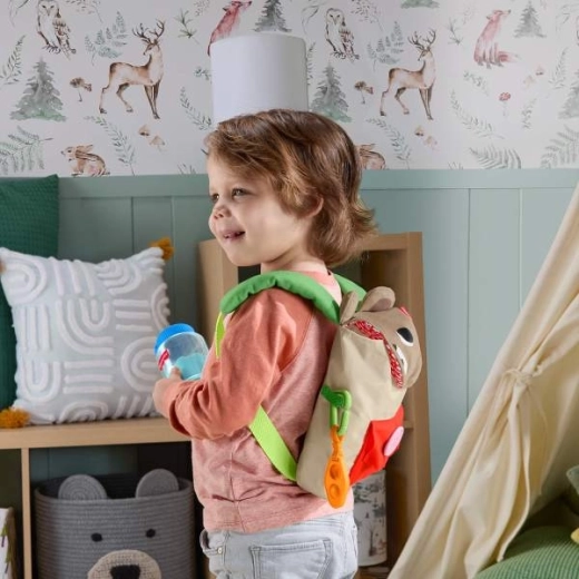 Der leichte Textilrucksack mit großem Knopf und Tasche fasst alle Accessoires. Bequeme Träger und eine robuste Verarbeitung sind ideal zum Spielen zu Hause und unterwegs.