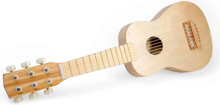 Diese naturfarbene Holzgitarre eröffnet Kindern die Welt von Rhythmus und Melodie. Dank sechs stimmbarer Saiten können sie die Grundlagen ausprobieren, ihr musikalisches Empfinden und ihre Ausdrucksfähigkeit entwickeln. Die langlebige Konstruktion aus hochwertigem Holz ist für tägliches Entdecken ausgelegt.