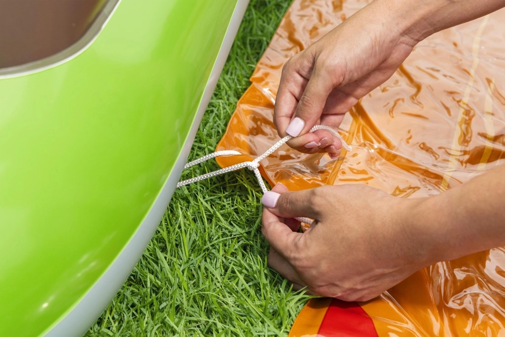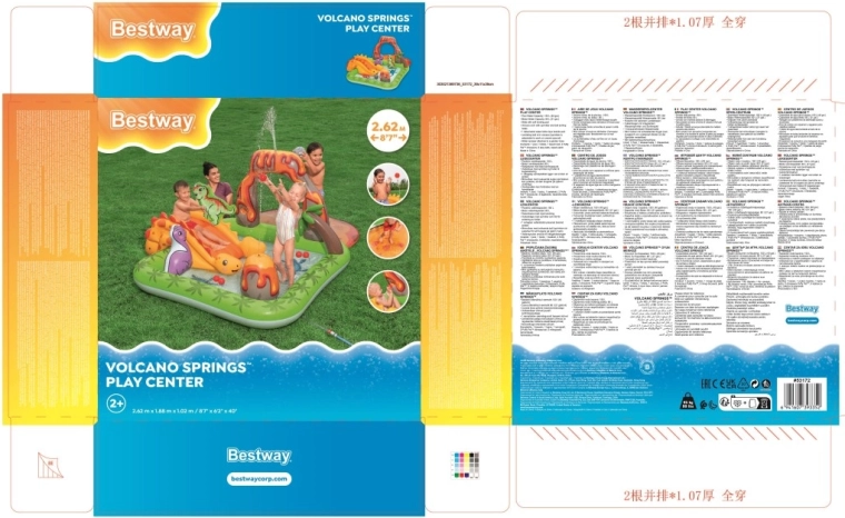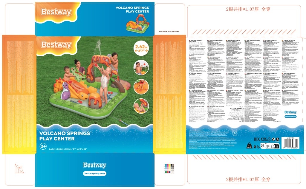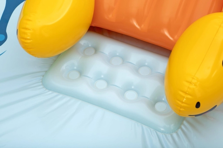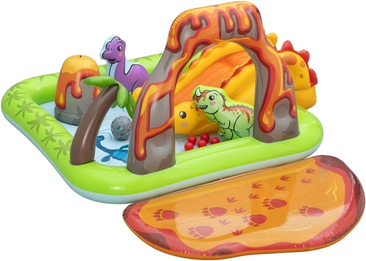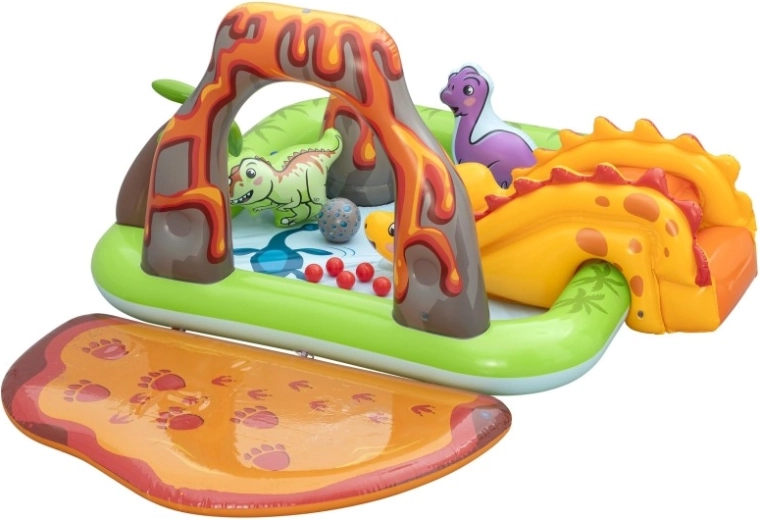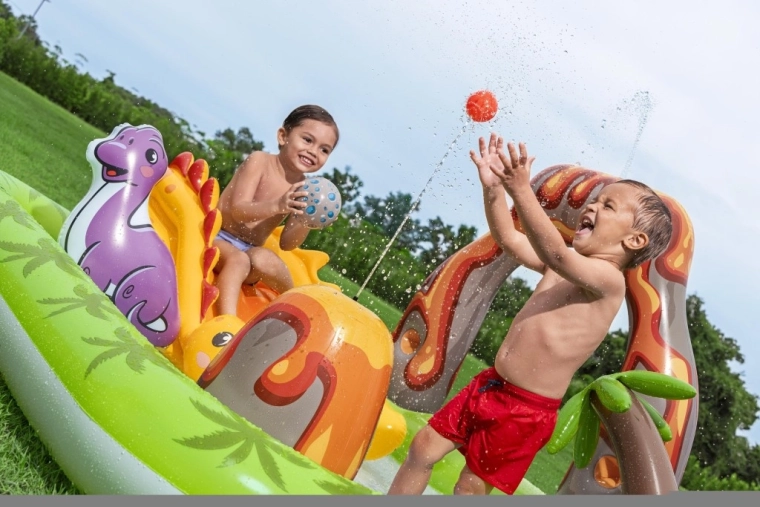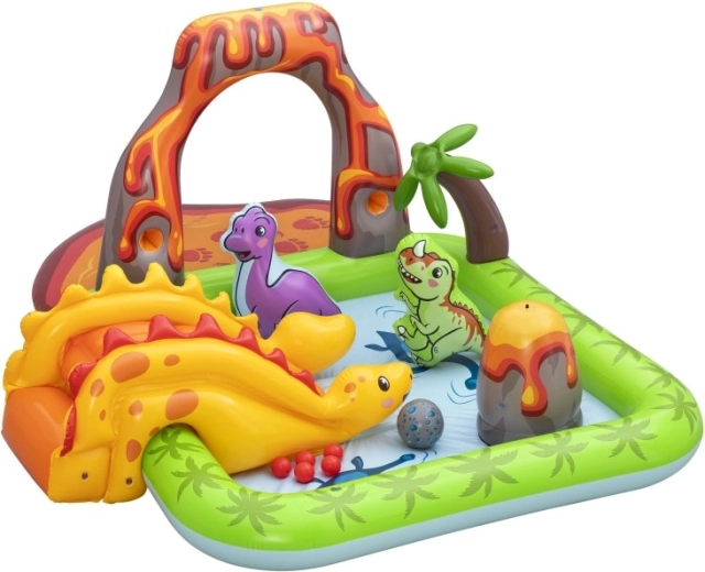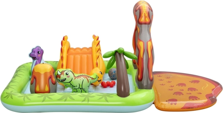 Zum Set gehören ein gelber Dinosaurier mit Rutsche, aufblasbare grüner und lilafarbener Dinosaurier als Spielfiguren, eine Öffnung im „Vulkan“ zum Bällewerfen sowie ein weiches Landekissen für eine sichere Ankunft. Dank hochwertigem Vinyl, glatter Nähte und abgerundeter Kanten ist das Spielen bequem und sicher. Schnelles Aufblasen, einfaches Ablassen und das beiliegende Reparaturflicken erleichtern Pflege und Aufbewahrung.