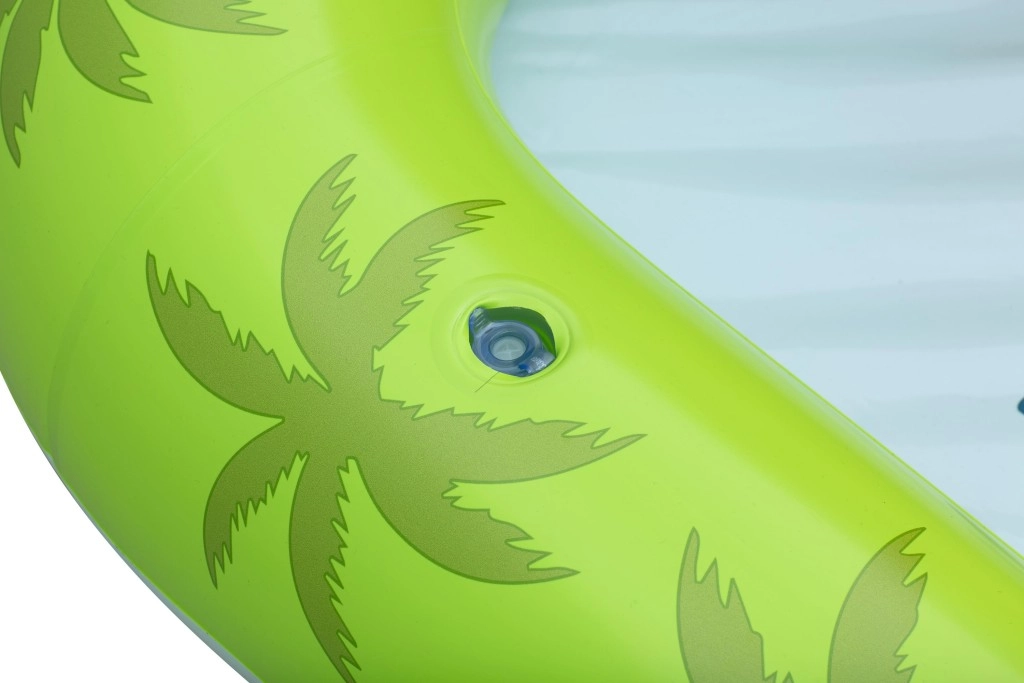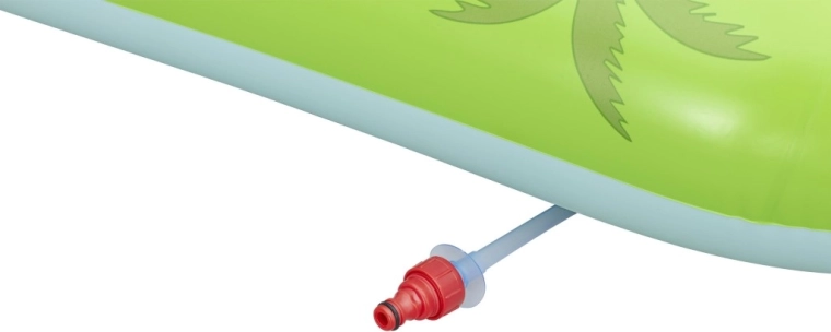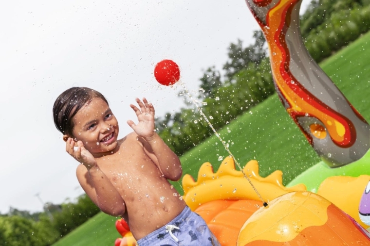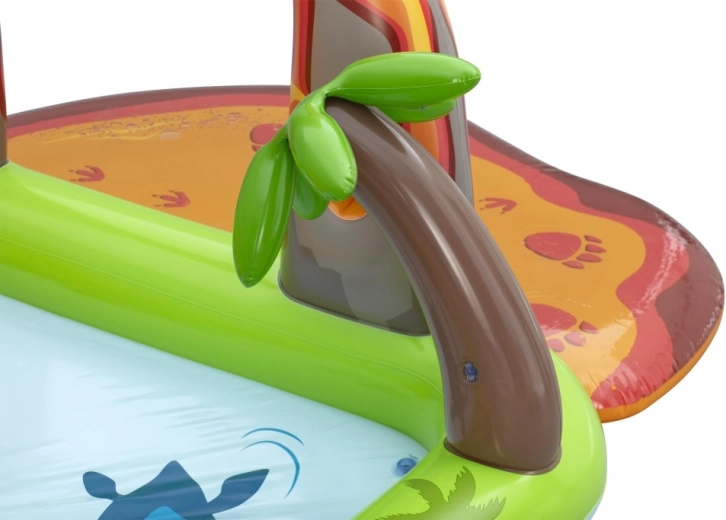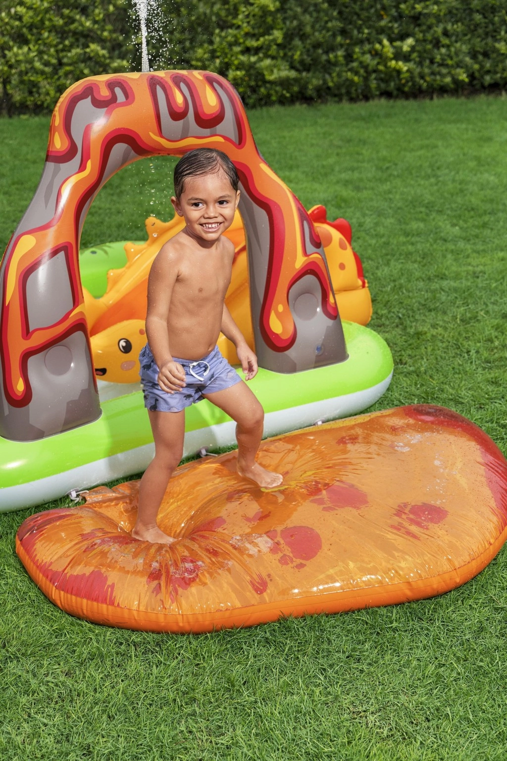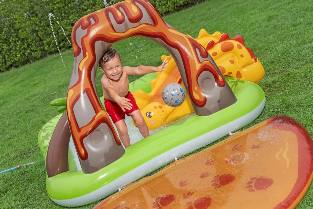Das aufblasbare Spielcenter mit Dinosauriern ist die ideale Wahl für aktiven Sommerspaß für Kinder ab 2 Jahren. Das grüne Becken mit Palmenaufdruck und blauem Boden fasst ca. 150 l Wasser, während die separate Wasser-Spielmatte mit Lava-Motiv weitere 80 l aufnimmt – für eine weiche Landung und fröhliches Hüpfen. Den integrierten Sprinkler am vulkanischen Bogen schließen Sie einfach an den Gartenschlauch an und erzeugen im Handumdrehen eine erfrischende Dusche.