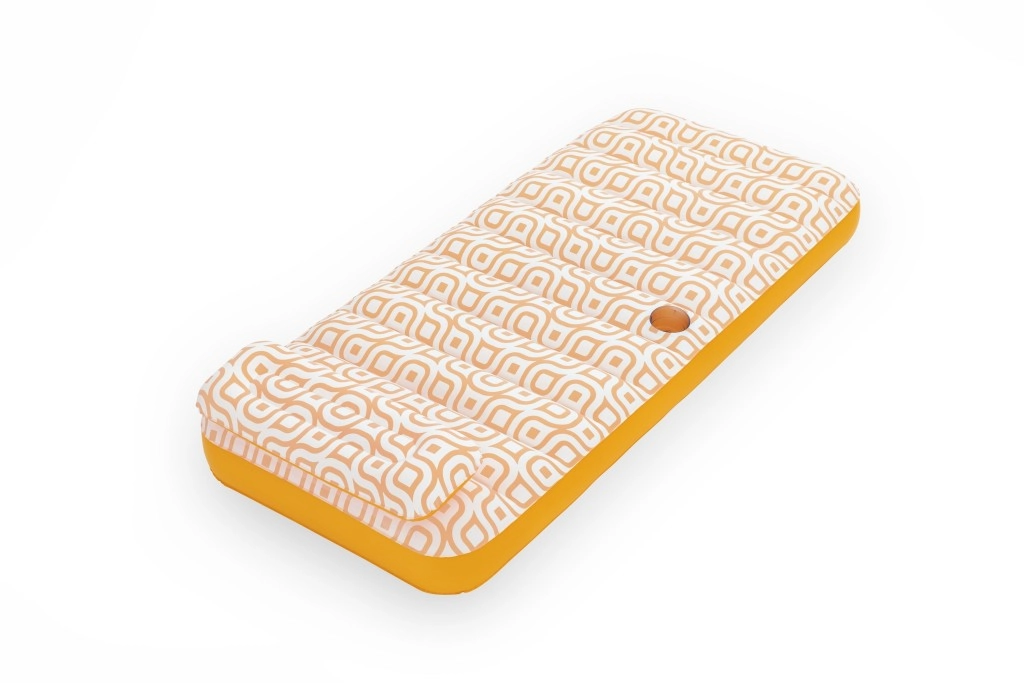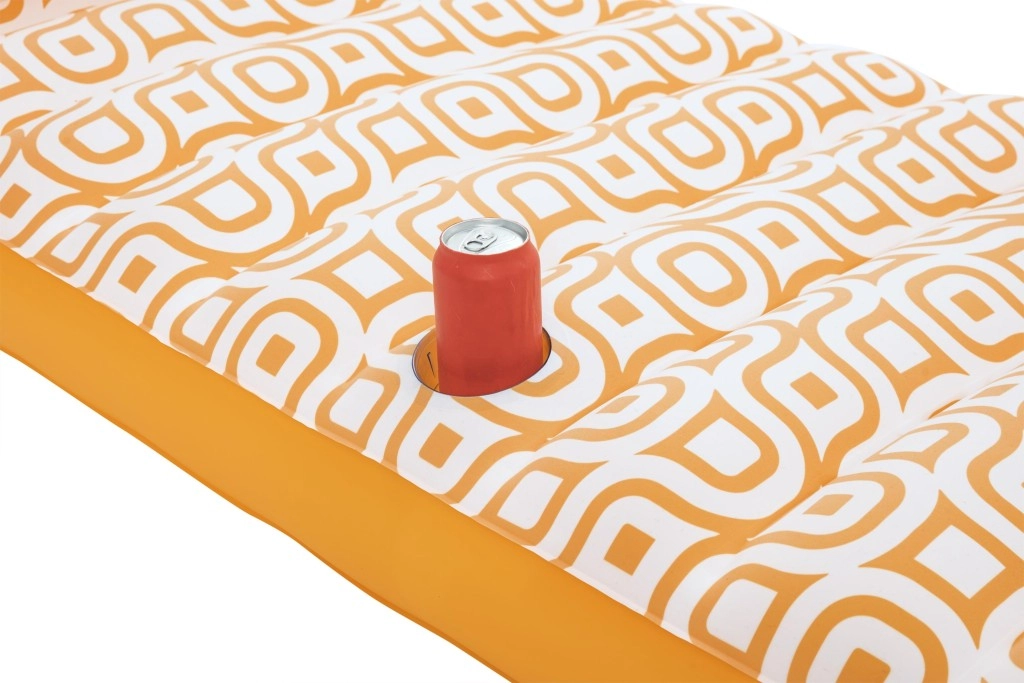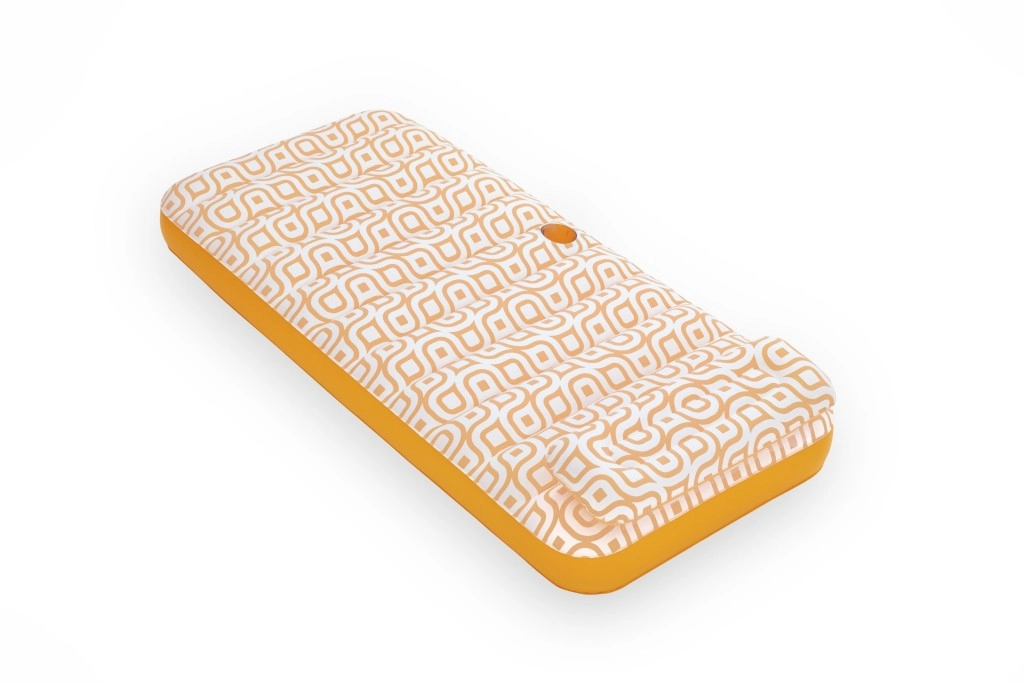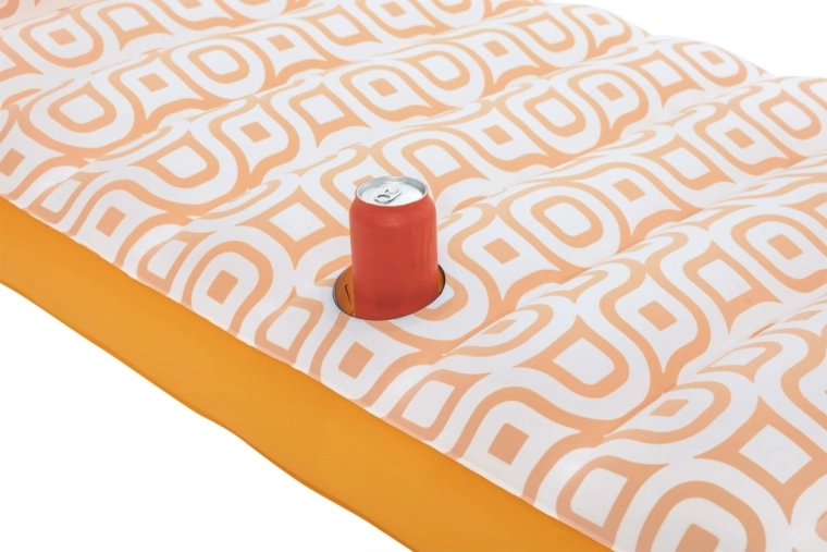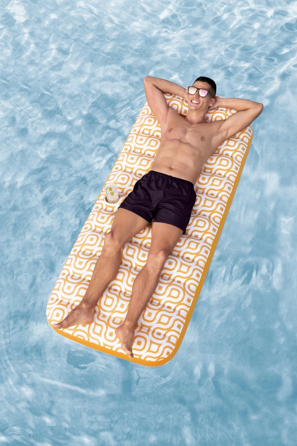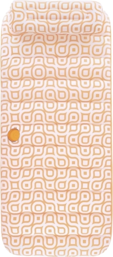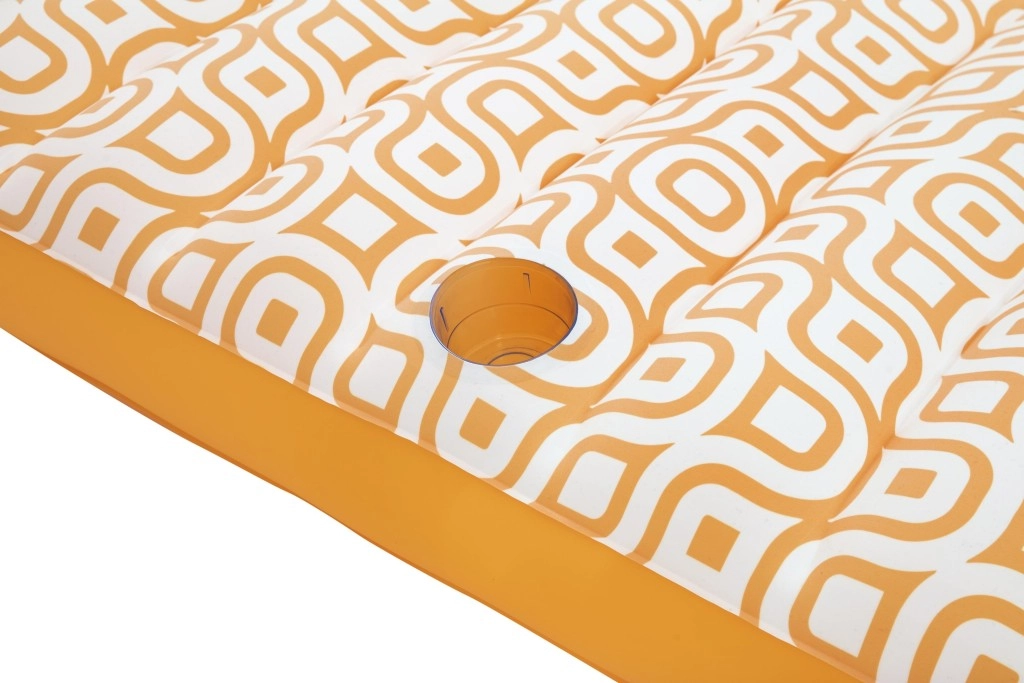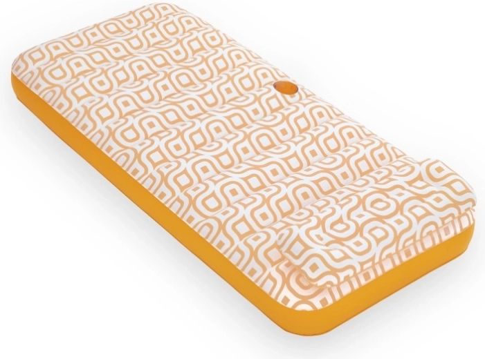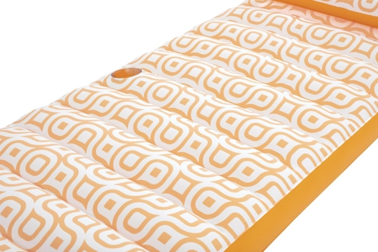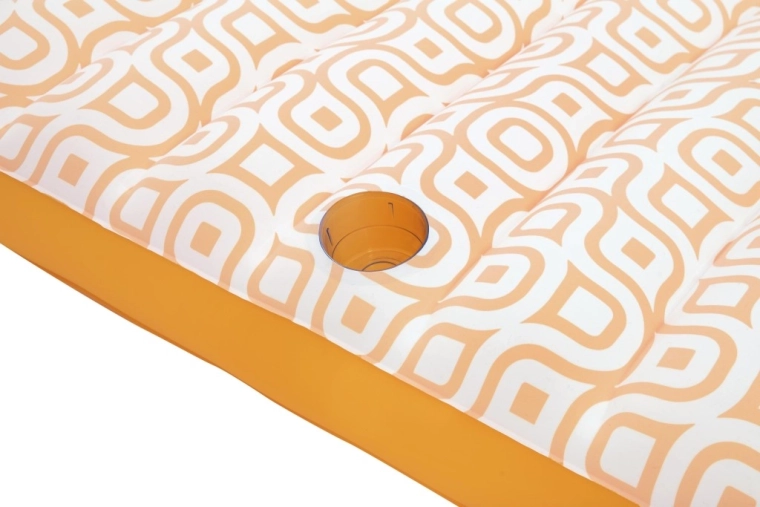 Die aufblasbare Luftmatratze Comfort Plush ist die ideale Wahl für Entspannung am Pool und auf ruhigen Gewässern. Die großzügige Liegefläche von 183 × 84 cm trägt problemlos eine erwachsene Person bis zu 100 kg, während das integrierte Kopfkissen für bequeme Kopfunterstützung sorgt. Die samtig-weiche, wasserabweisende Oberfläche mit retro-geometrischem Muster in Weiß-Orange verleiht einen eleganten Look und ein angenehmes Hautgefühl.