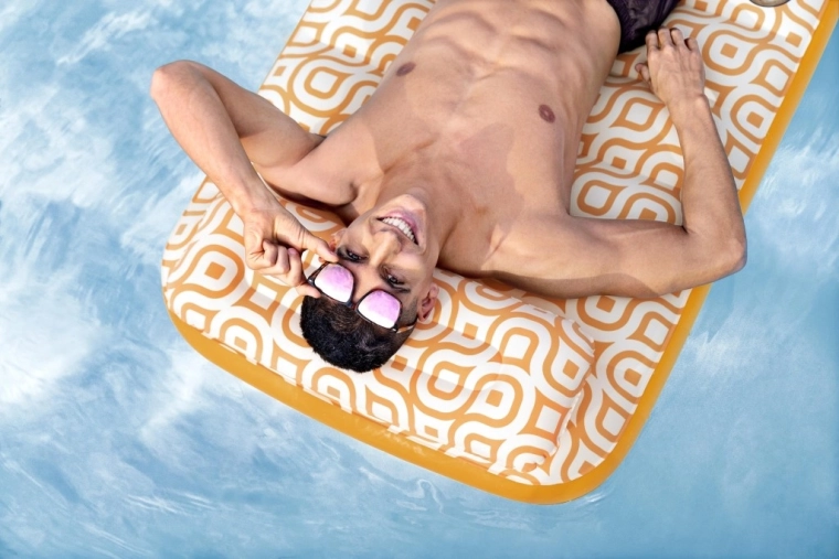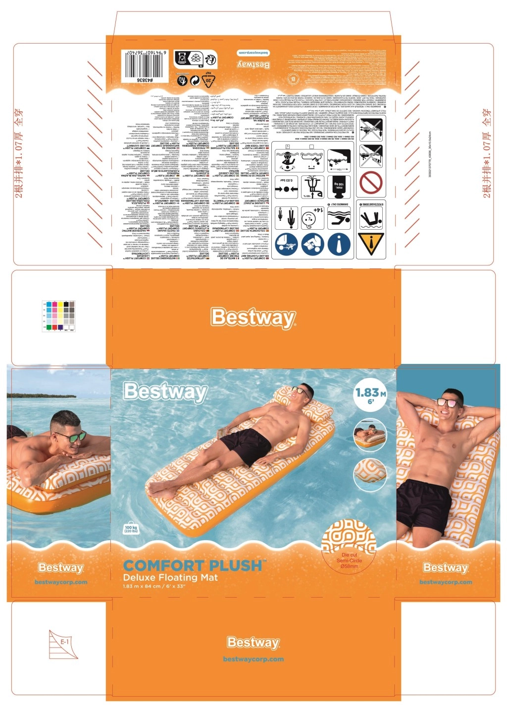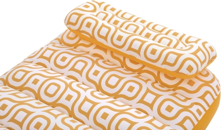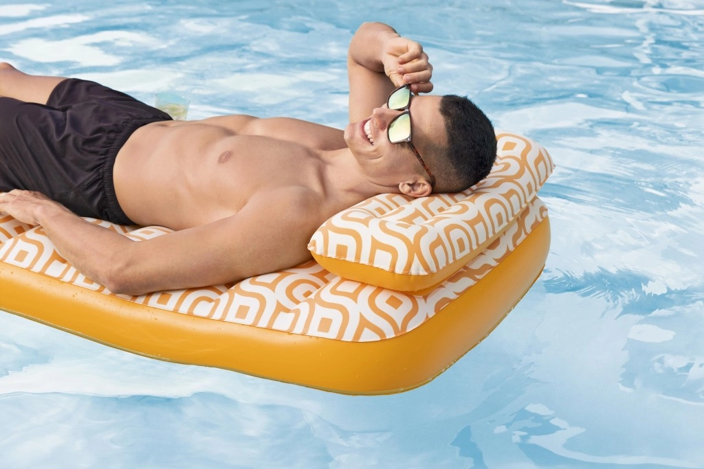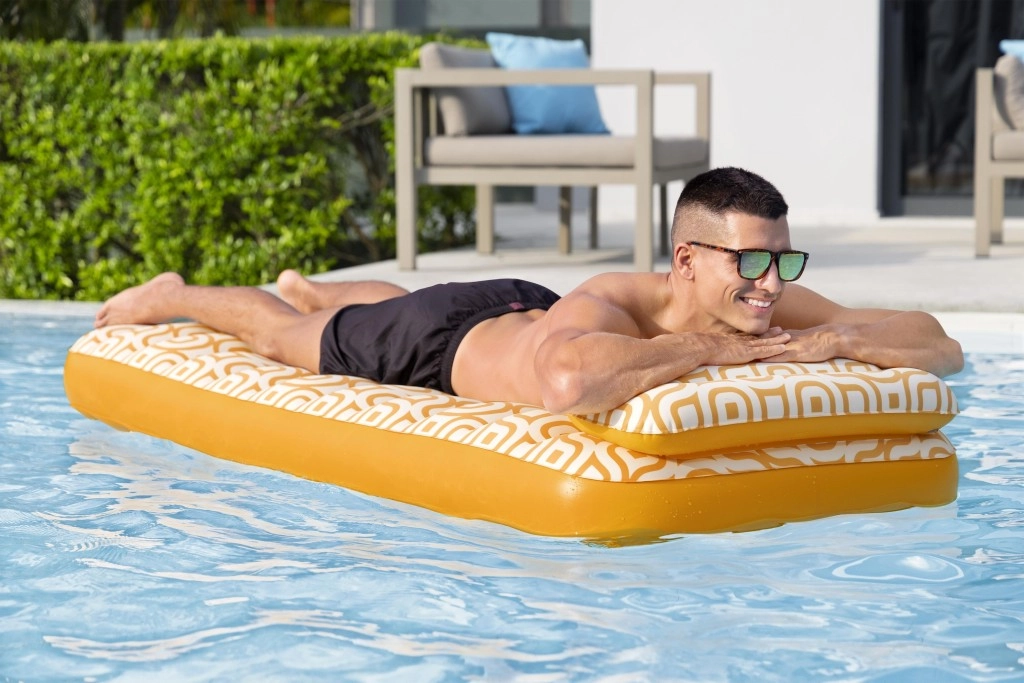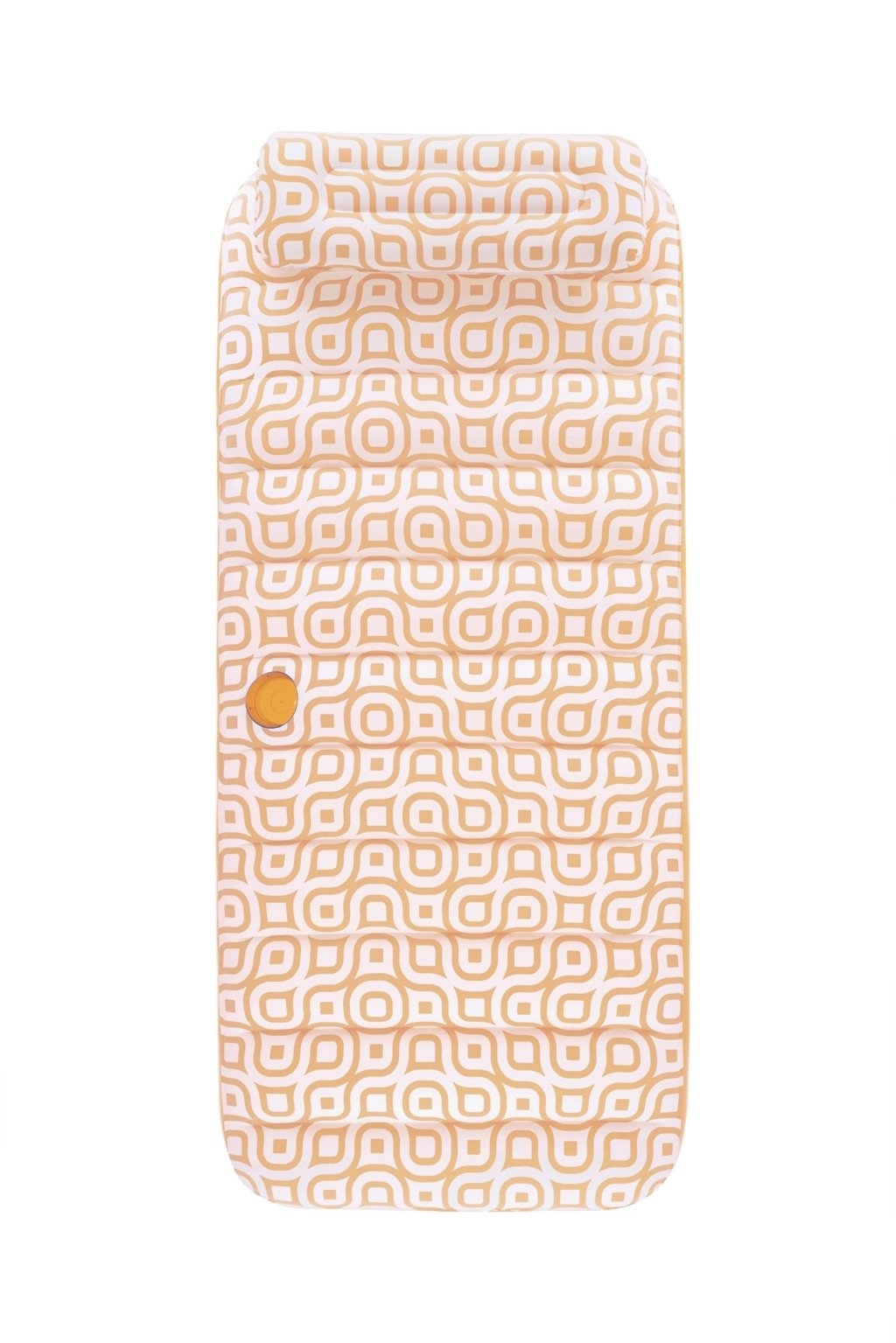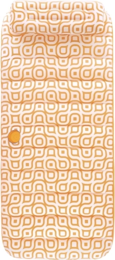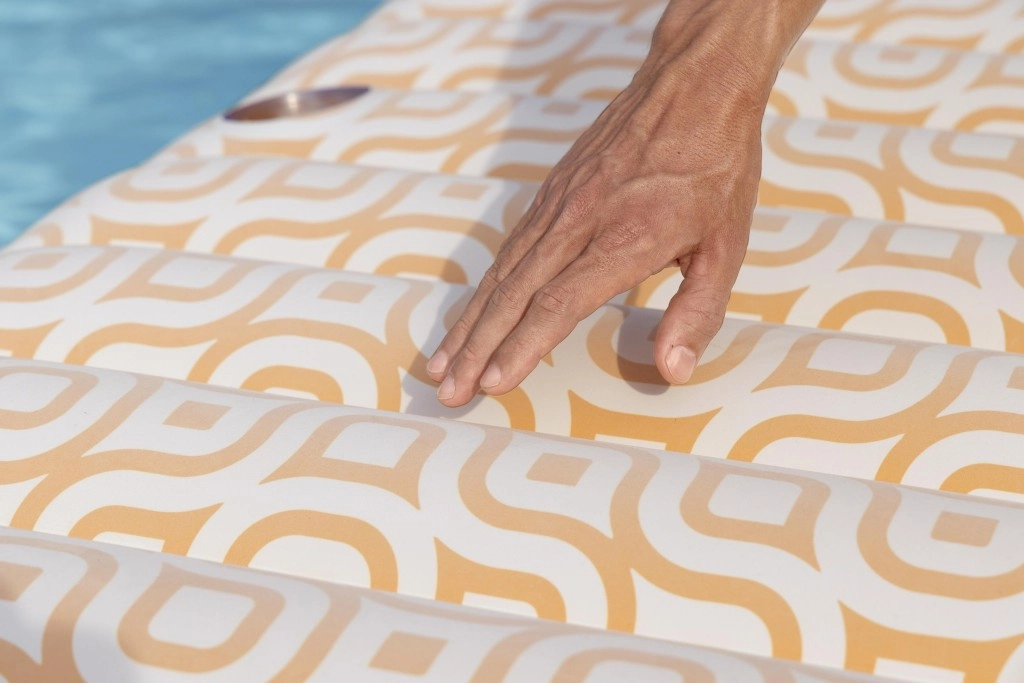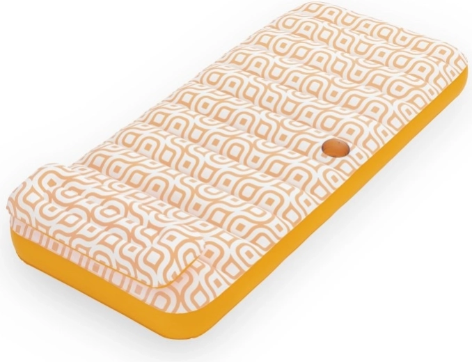 Die aufblasbare Luftmatratze Comfort Plush ist die ideale Wahl für Entspannung am Pool und auf ruhigen Gewässern. Die großzügige Liegefläche von 183 × 84 cm trägt problemlos eine erwachsene Person bis zu 100 kg, während das integrierte Kopfkissen für bequeme Kopfunterstützung sorgt. Die samtig-weiche, wasserabweisende Oberfläche mit retro-geometrischem Muster in Weiß-Orange verleiht einen eleganten Look und ein angenehmes Hautgefühl.
