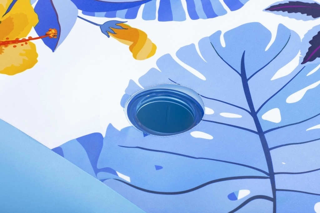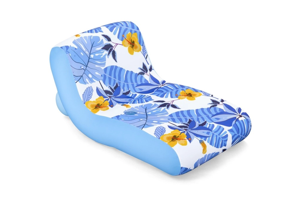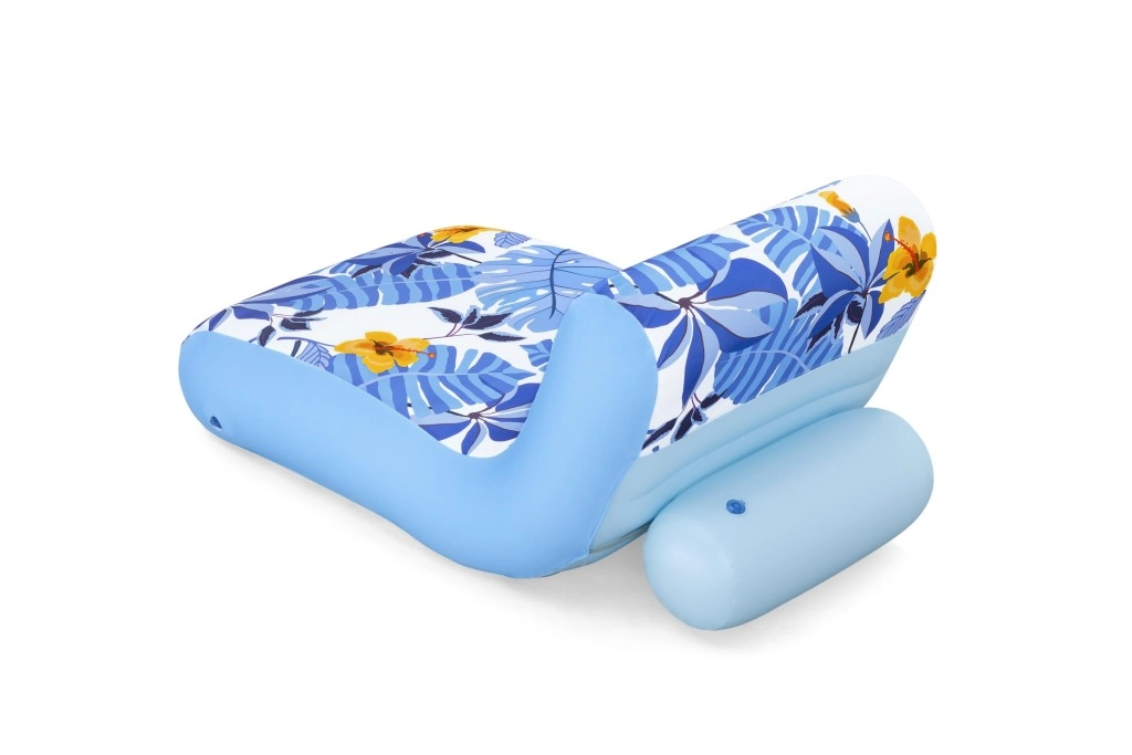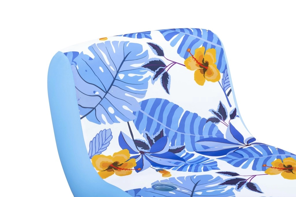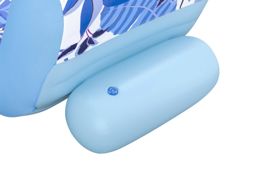 Die Oberfläche besteht aus einem abnehmbaren Textilbezug mit tropischem Muster aus blauen Blättern und gelben Blüten. Der Bezug lässt sich leicht in der Maschine waschen und ist mit UV-Schutz UPF 50+ ausgerüstet, sodass die frischen Farben lange erhalten bleiben. Der robuste PVC-Körper und zwei separate Luftkammern verleihen der Liege Stabilität, Sicherheit und Widerstandsfähigkeit gegen normale Abnutzung.