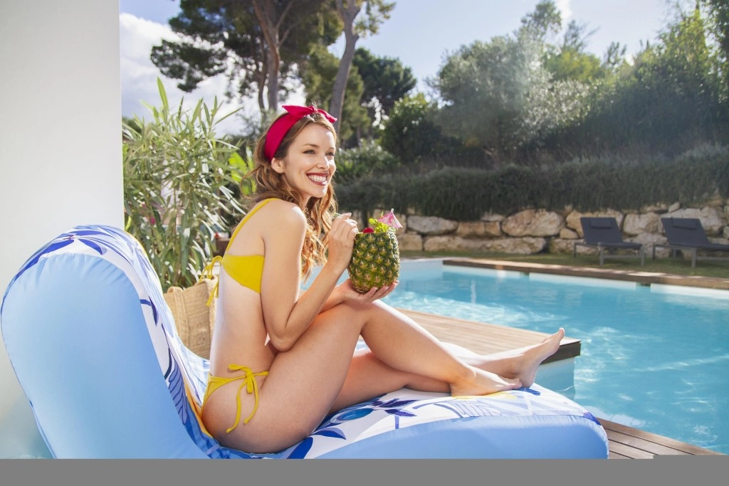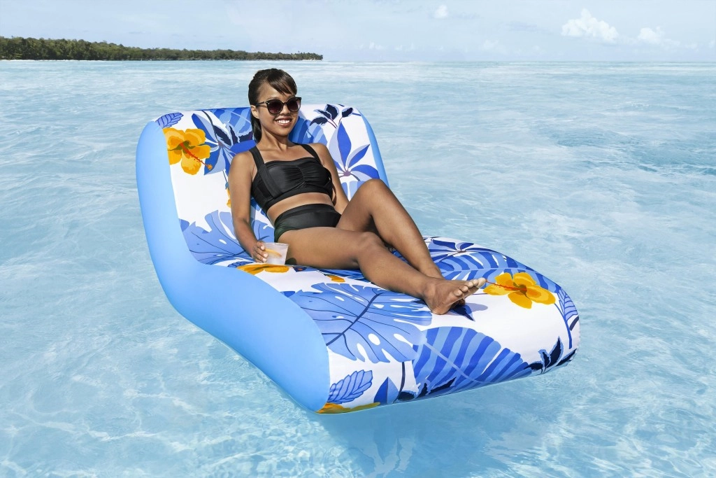 Die aufblasbare Liege Blissful Drifter ist für entspanntes Relaxen im Pool oder Garten konzipiert. Mit den Maßen 176 × 107 cm bietet sie ausreichend Platz zum Sitzen und Liegen. Die ergonomische Konstruktion mit erhöhter Rückenlehne und einer Stabilisierungsrolle im unteren Körperbereich unterstützt eine korrekte Haltung und ein angenehmes Schaukeln auf dem Wasser.
