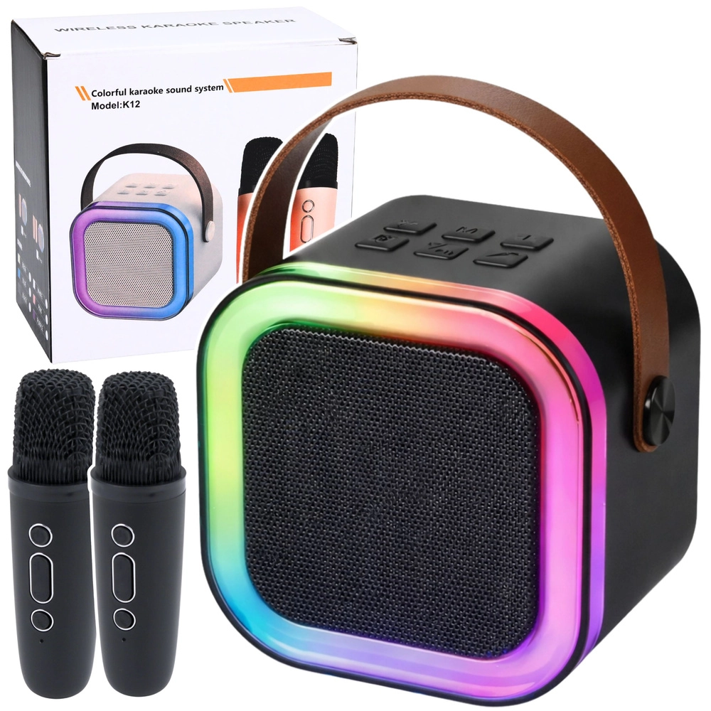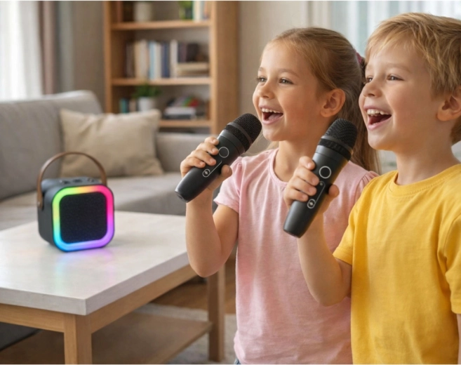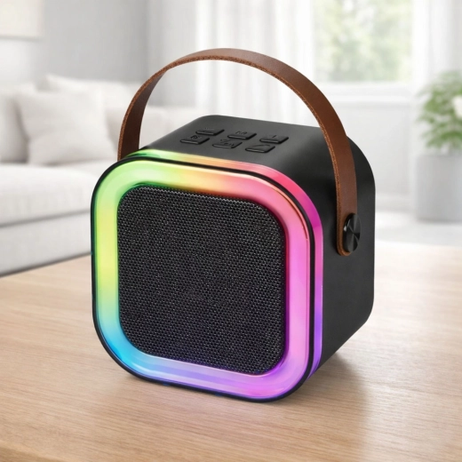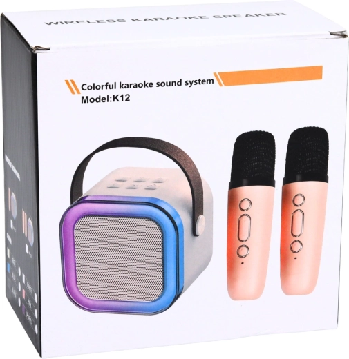Genieße Gesang jederzeit und überall. Dieses portable Karaoke-Set kombiniert einen stylischen Cube-Lautsprecher mit mehrfarbigem LED-Ring und zwei kabellosen Mikrofonen für Duette und Wettbewerbe. Das leichte Design, die praktische Trageschlaufe und die Stromversorgung über den integrierten Akku machen es zur idealen Wahl für Geburtstage, Familientreffen und Gartenpartys.