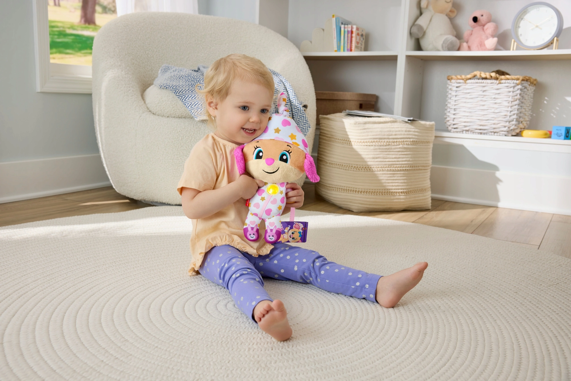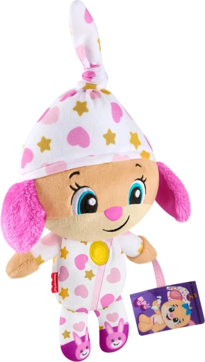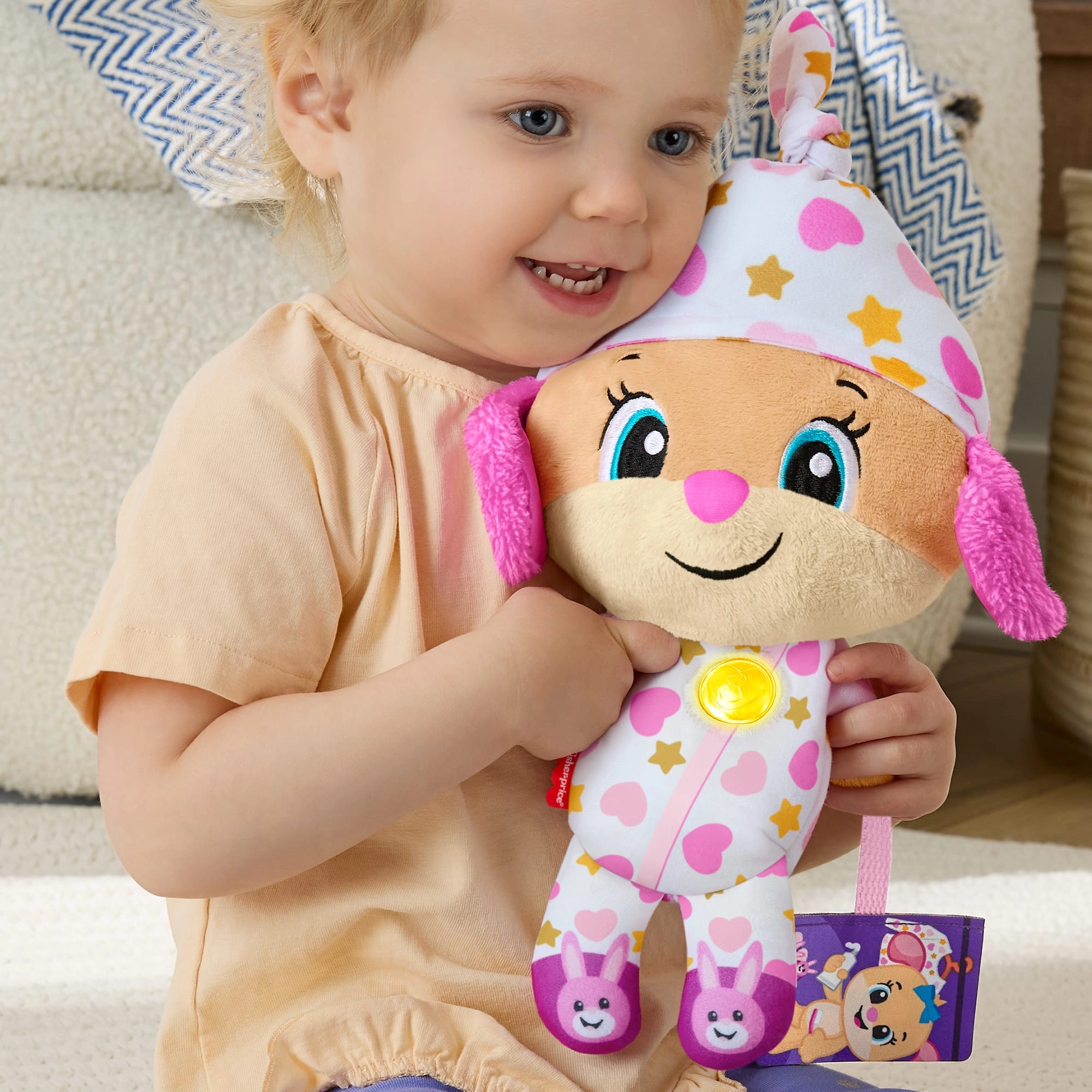 Die interaktive Plüschfigur Lerne und Lache! ist der ideale Begleiter für abendliche Rituale und ruhige Momente am Tag. Im Pyjama mit verspielten Mustern und einem leuchtenden Herzchen schafft sie eine angenehme Atmosphäre zum Runterkommen, Entspannen und Einschlafen.
