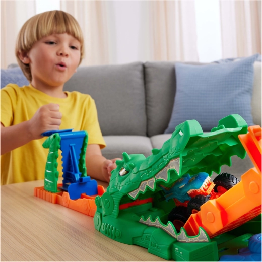 Dieses farbenfrohe Stuntset verbindet Action, Spannung und kreatives Spiel. Schieße Mega Wrex die orangefarbene Rampe hinauf, bezwinge die Fallbrücke und versuche, über das hungrige Krokodil zu springen – oder du landest direkt in seinem Maul. Das Ergebnis hängt von der Abschusskraft ab, dadurch ist jede Fahrt anders und Kinder trainieren Koordination und Einschätzung.