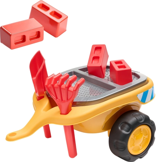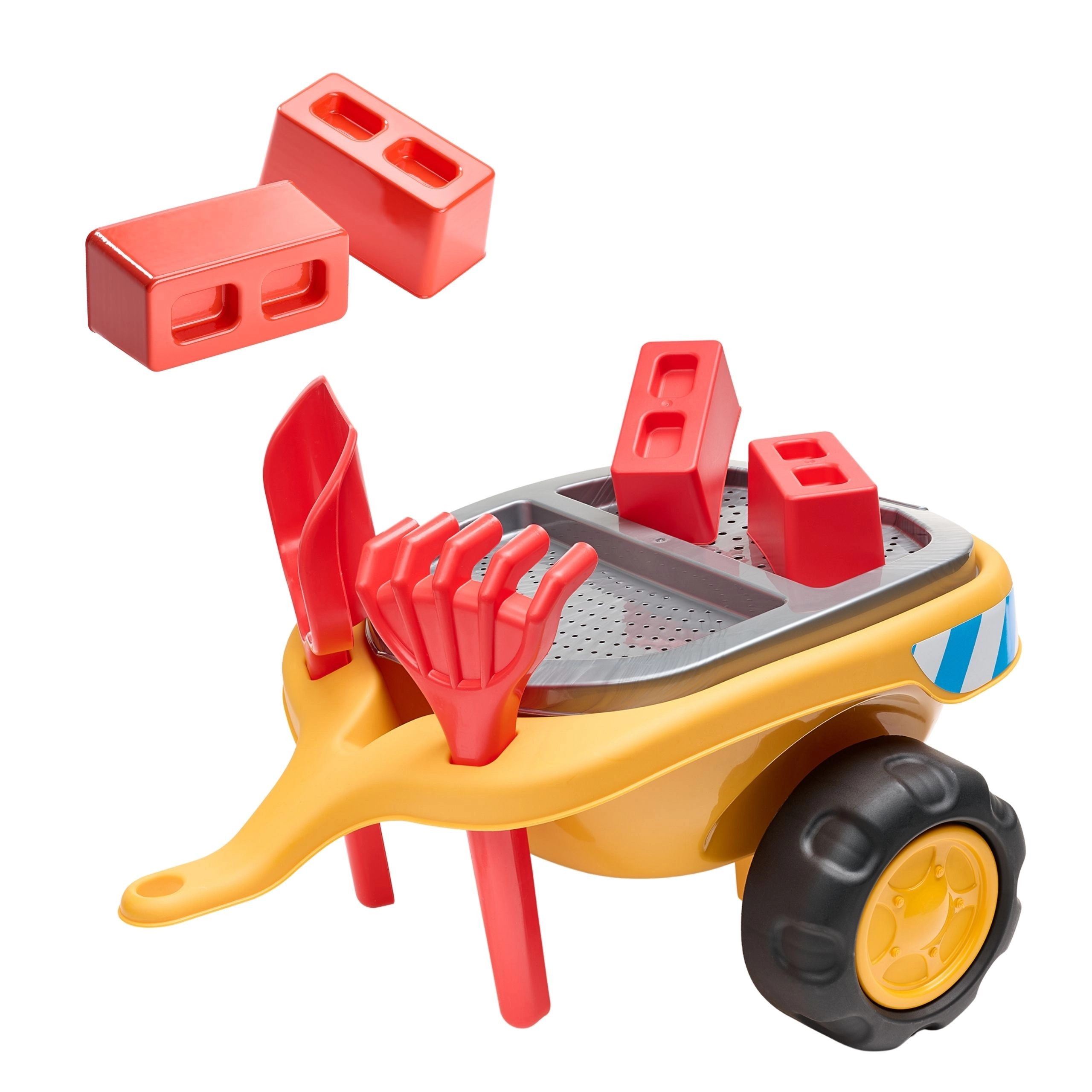 Inklusive Anhänger zum Transport von Sieb, Schaufel, Harke und „Ziegelsteinen“. Fördert kreatives Spiel und die Motorik beim Beladen und Entladen.