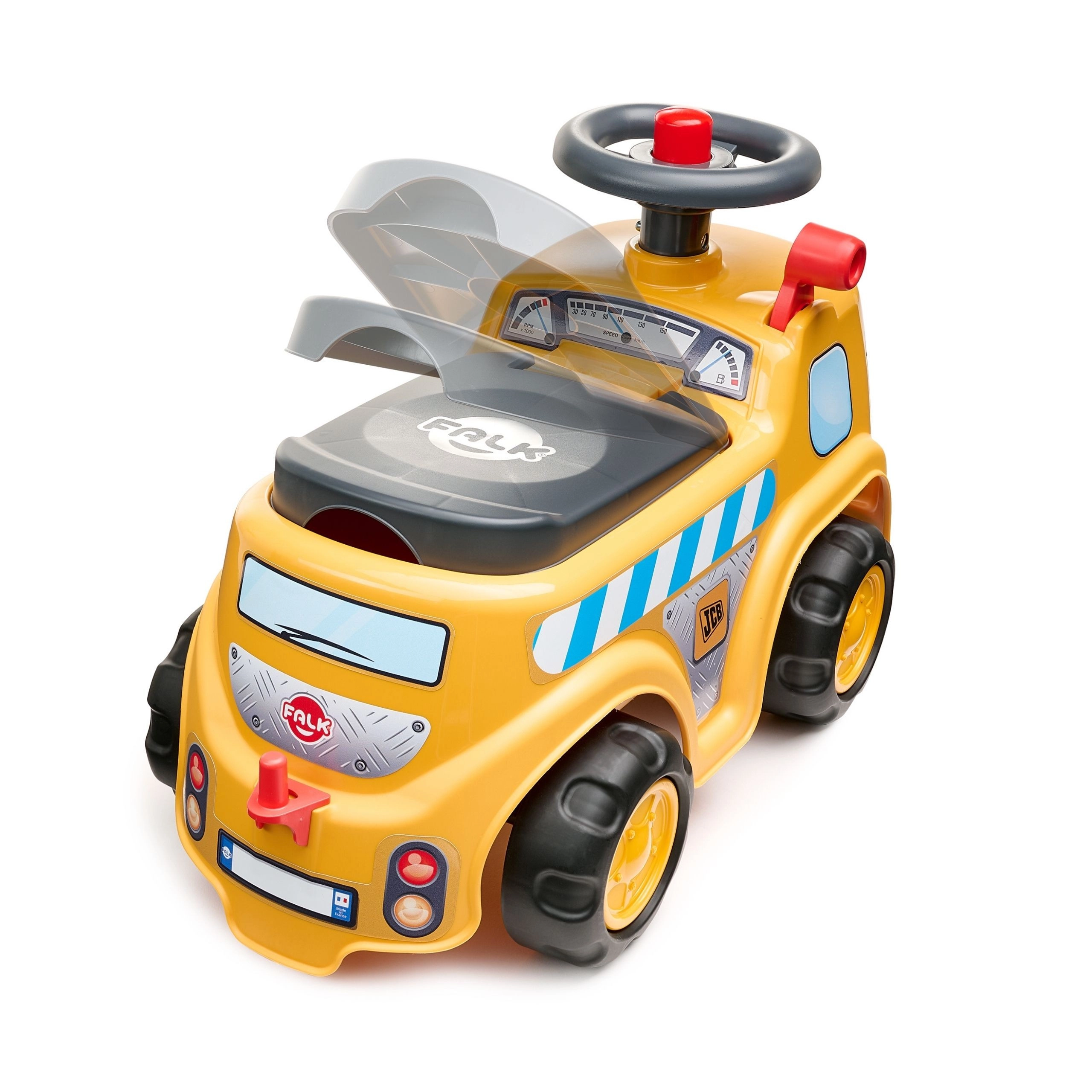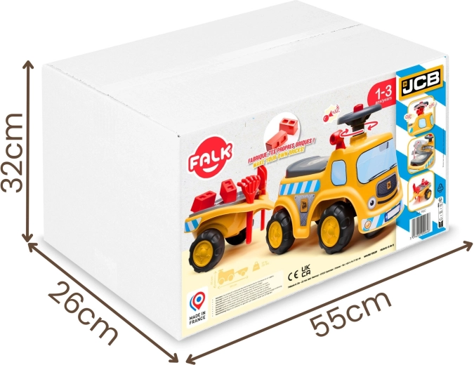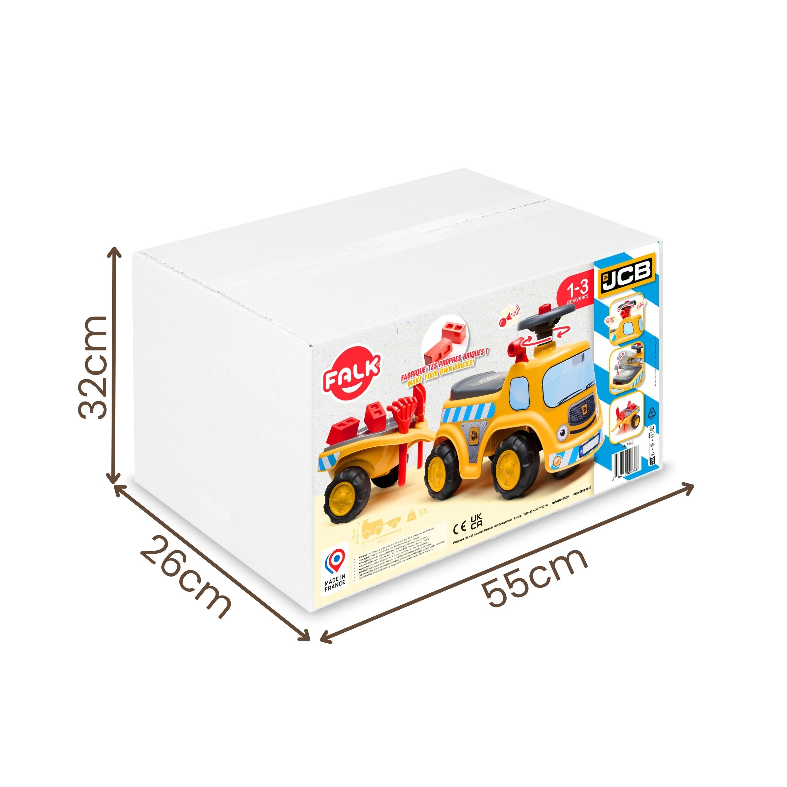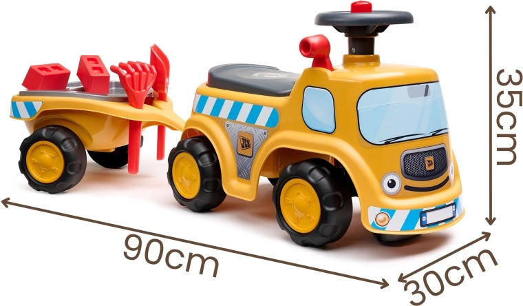 Praktische Details erhöhen Spaß und Nutzen: Unter dem klappbaren Sitz gibt es eine Schatzbox, der Anhänger lässt sich leicht abkoppeln und mit Sieb, Schaufel, Harke und „Ziegelsteinen“ beladen. Das Laufrad fördert Grobmotorik, Gleichgewicht, Koordination und kreatives Bauspiel – drinnen wie draußen.