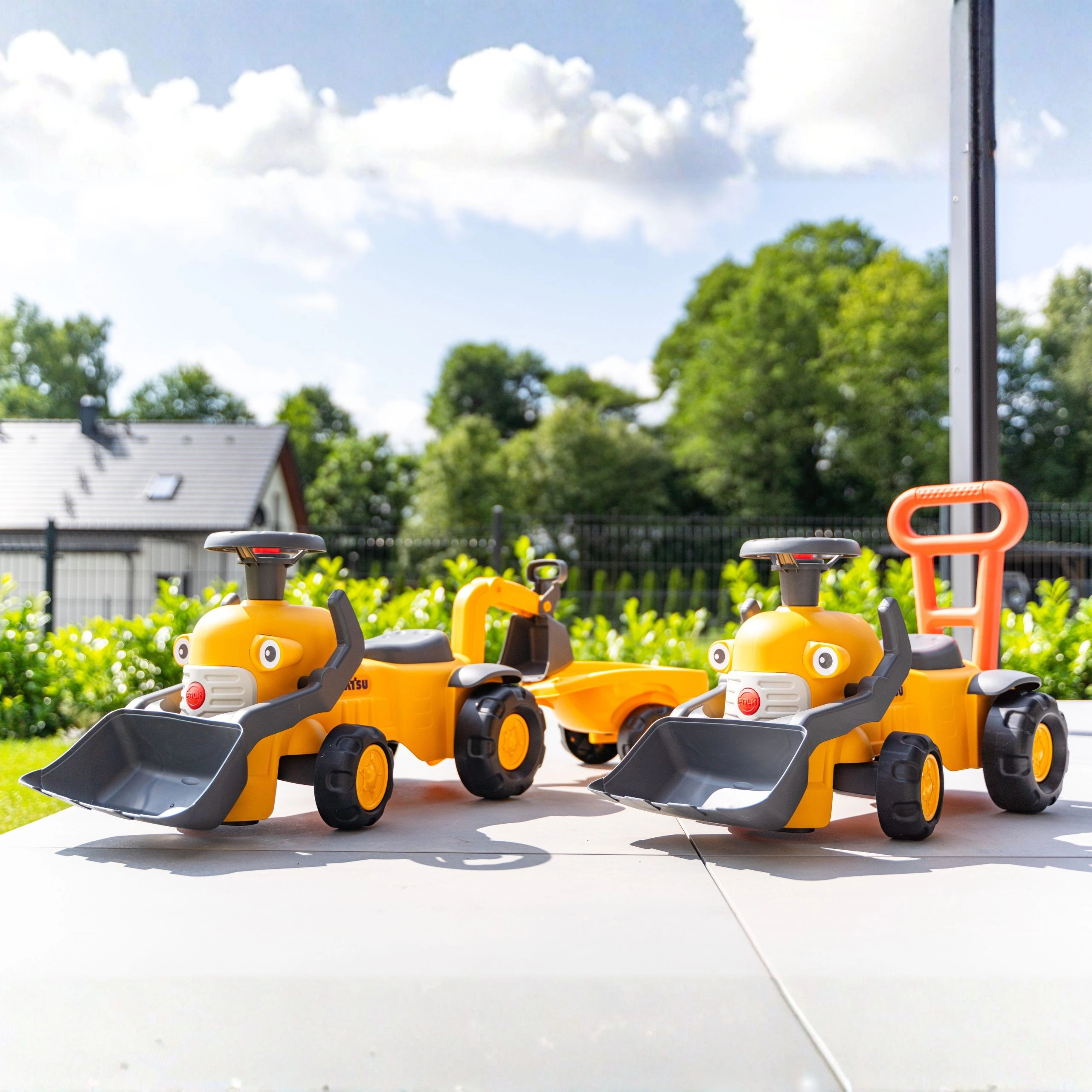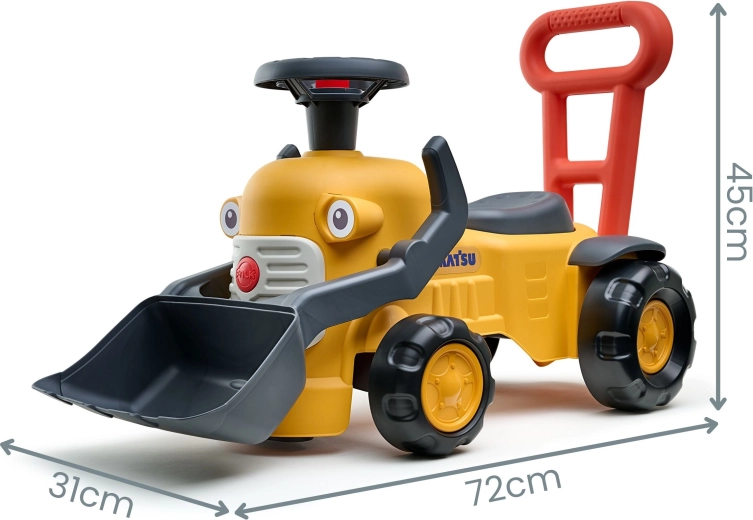 Dieses Kinder-Rutschfahrzeug im Design der Baumaschine KOMATSU verbindet Spielspaß mit Kompetenzentwicklung. Dank der mechanisch bedienbaren Frontschaufel können kleine Baumeister Sand oder Bausteine aufnehmen, während die Hupe am Lenkrad für realistische Spielmomente sorgt. Die hohe, ergonomische Rückenlehne/Griff dient als Schiebestange für die ersten Schritte und mehr Stabilität.